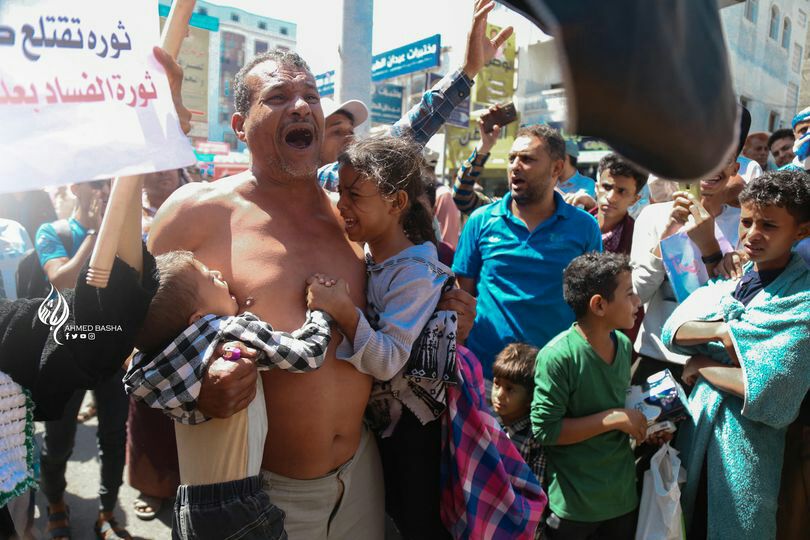وفي الصورة يظهر، المتظاهرين الذين خرجوا في محافظة تعز للمطالبة بمحاسبة الفاسدين في السلطلة المحلية كان يصرخ هذا المواطن بحرقة عالية وحاول حرق ملابسة بكى وابكى اطفالة الذي كانوا معه.