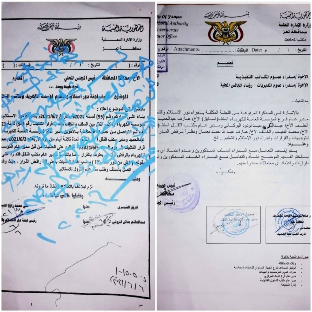 وتشير الوثيقة الصادرة عن محافظ تعز نبيل شمسان إلى رفض كل من مدير عام فرع مؤسسة الكهرباء بتعز / عارف عبدالحميد ، ومدير مكتب النقل / محمد النقيب لقرار اقالتهما من قبل المحافظ الصادر يوم الثلاثاء الماضي.