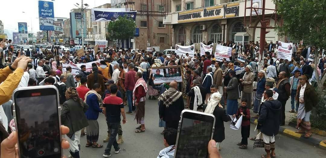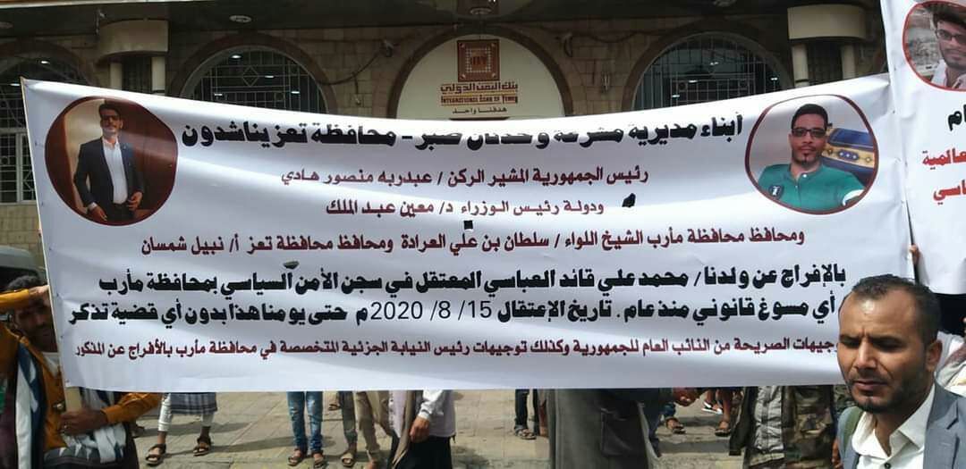 خرج المئات من ابناء مديرية صبر مشرعة وحدنان في تظاهرة حاشدة أمام مبنى السلطة المحلية بتعز للمطالبة بإطلاق سراح ابنهم محمد على قائد العباسي المحتجز لدى الأمن السياسي بمأرب.