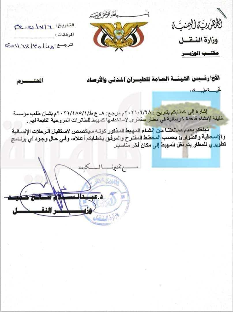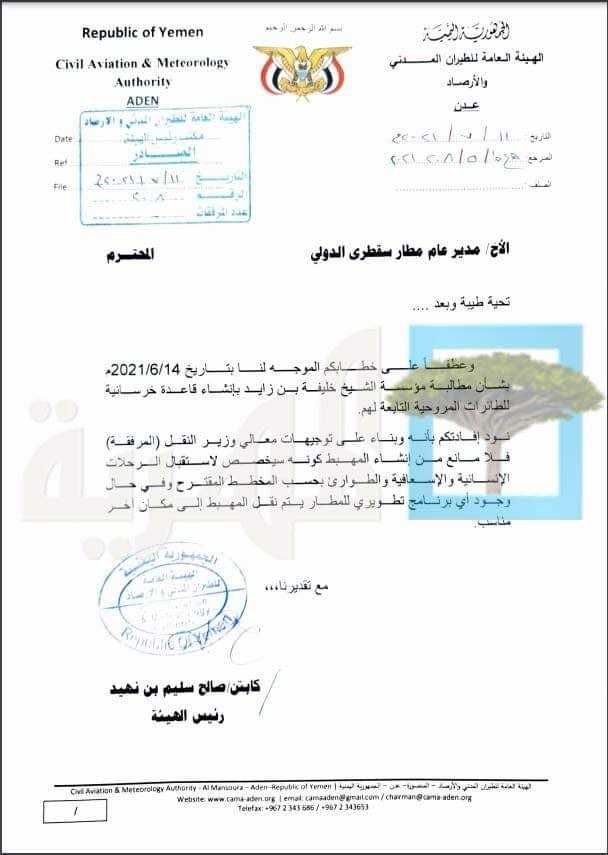 إشارة إلى خطابكم بتاريخ 28 / 6 / 2021م مرجع :هـ ع ط /1/ 185/2021م بشأن طلب مؤسسة خليفة لإنشاء قاعدة خرسانية في مطار سقطرى لاستخدامها كمهبط للطائرات المروحية التابعة لهم .