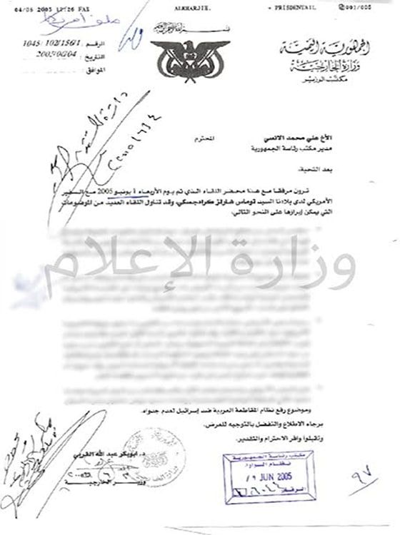 ويتضح من خلال الوثائق تعاطي نظام علي صالح بإيجابية مع التوجيهات الأمريكية لإنهاء المقاطعة للبضائع الإسرائيلية، ففي محضر لقاء جمع وزير الخارجية اليمني حينها أبو بكر القربي مع السفير الأمريكي بصنعاء توماس كاردجسكي بتاريخ 1 يونيو 2005 ، يتبين تمكُن أمريكا من توظيف سلطة صالح لحساب رفع نظام المقاطعة العربية ضد الكيان الصهيوني.” .