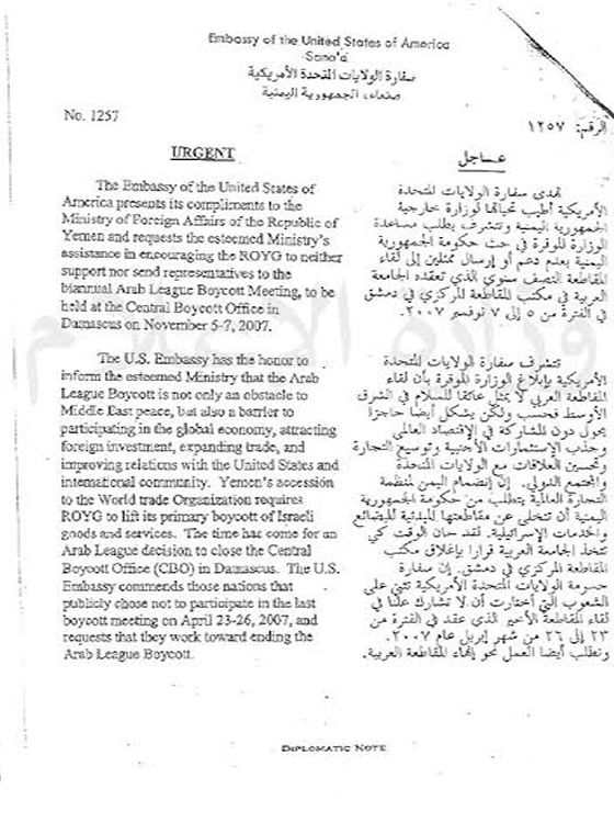 وكما اظهرت الوثائق مذكرة ” مصنفة تحت عنوان “عاجل” صادرة عن السفارة الأمريكية بصنعاء بتاريخ 4 نوفمبر 2007 موجهة إلى الخارجية اليمنية تضمنت جملة من التوجيهات الأمريكية للنظام السابق وعلى رأسها “عدم دعم أو إرسال ممثلين إلى لقاء المقاطعة النصف سنوي الذي تعقده الجامعة العربية في مكتب المقاطعة المركزي بدمشق في الفترة من ٥ إلى ٧ نوفمبر ٢٠٠٧م “.