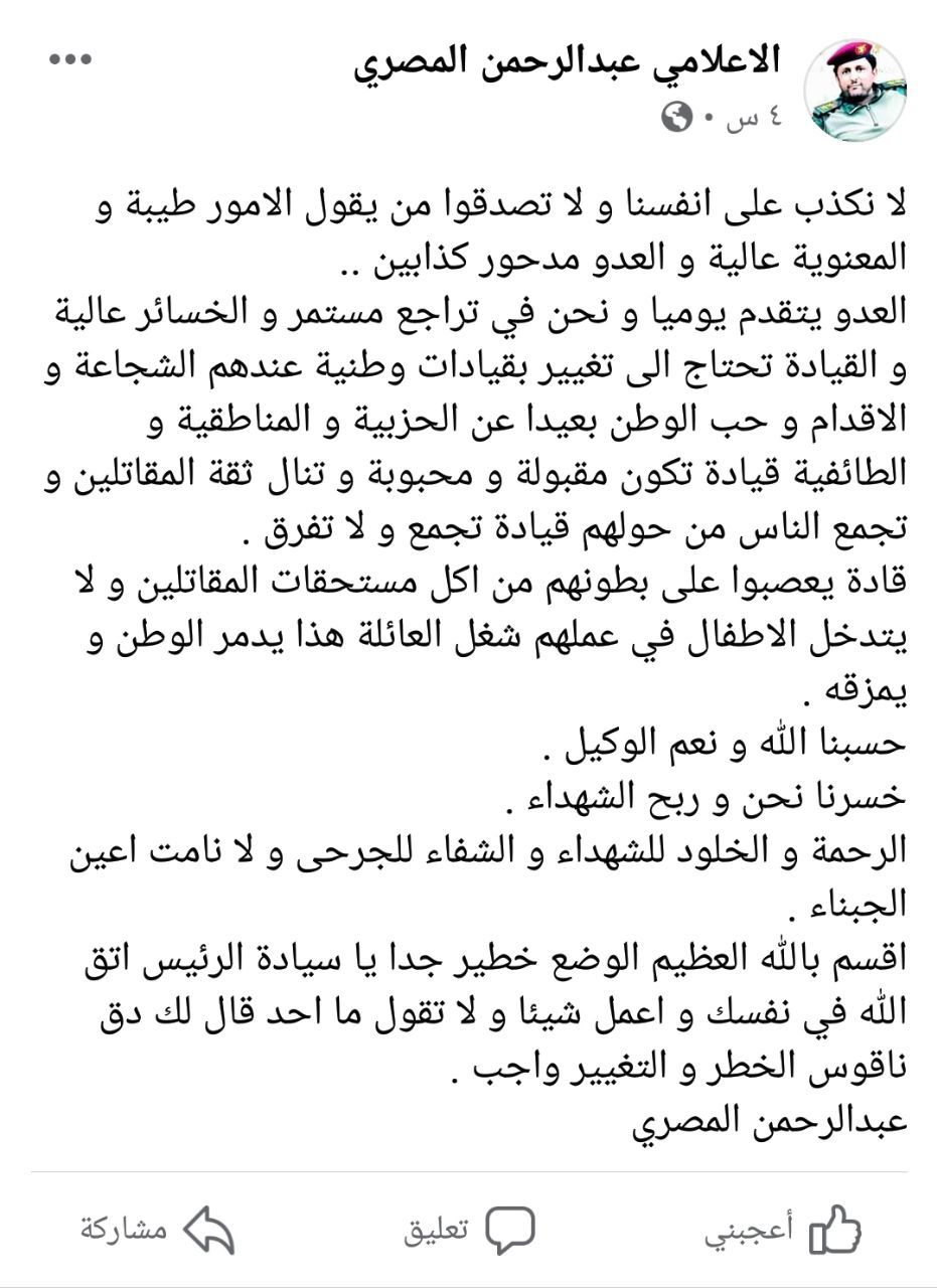 وقال عبدالرحمن المصري في منشور له على موقع فيسبوك :” لا نكذب على أنفسنا ولا تصدقوا من. يقول الامور طيبه والمعنوية عالية والعدو مدحور كذابين ..