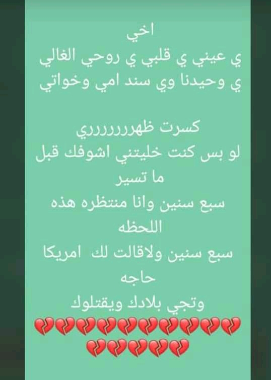 ووجهت ياسمين السنباني رسالة مؤثرة لشقيقها الذي توفى اليوم إثر تعرضة لإطلاق نار من قبل مسلحين في طور الباحة