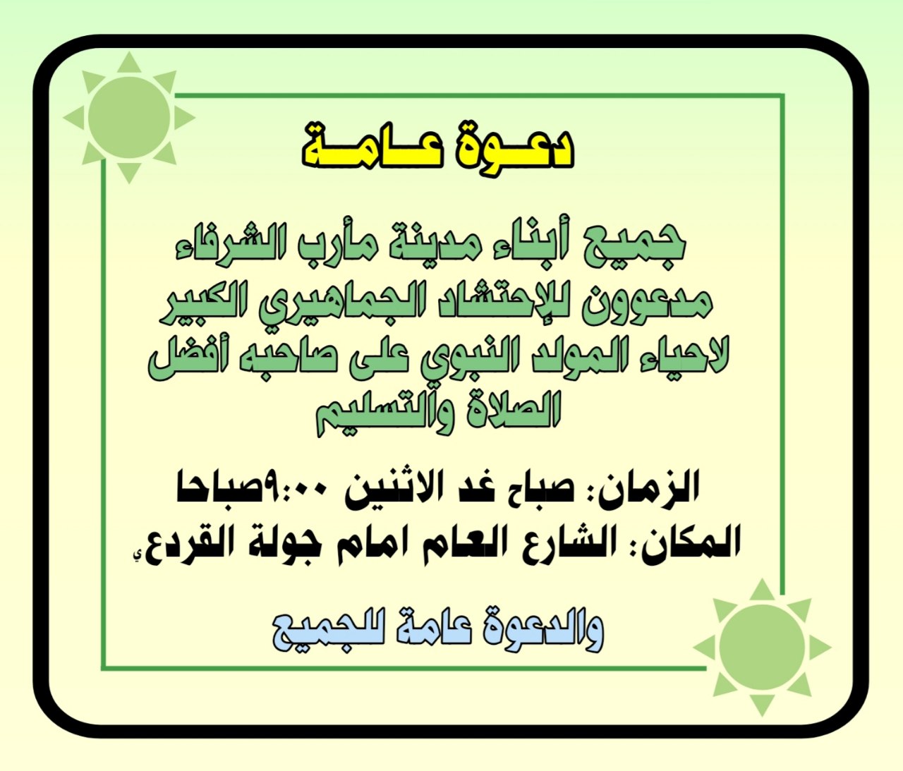 ولفت النشطاء الى أن الاحتفال بمناسبة المولد النبوي الشريف يكتسب أهميته الدينية والتاريخية ومغزاه العميق من عظمة التحول المحمدي الذي صنعته الرسالة المحمدية في حياة شعوب الامة الاسلامية وواقع وطننا اليمني بعد كفاح طويل ومرير خاضته طلائع الجيوش الإسلامية ضد قوى الشرك والاستكبار بقيادة النبي محمد صلى الله عليه وسلم.