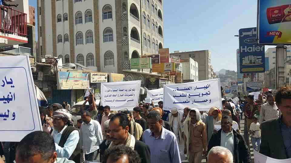 وحذر المتظاهرون الحكومة اليمنية من استمرارها بالسماح للتحالف بتصدير النفط والثروات اليمنية واستمرار اغلاق التحالف للموانئ والمطارات .