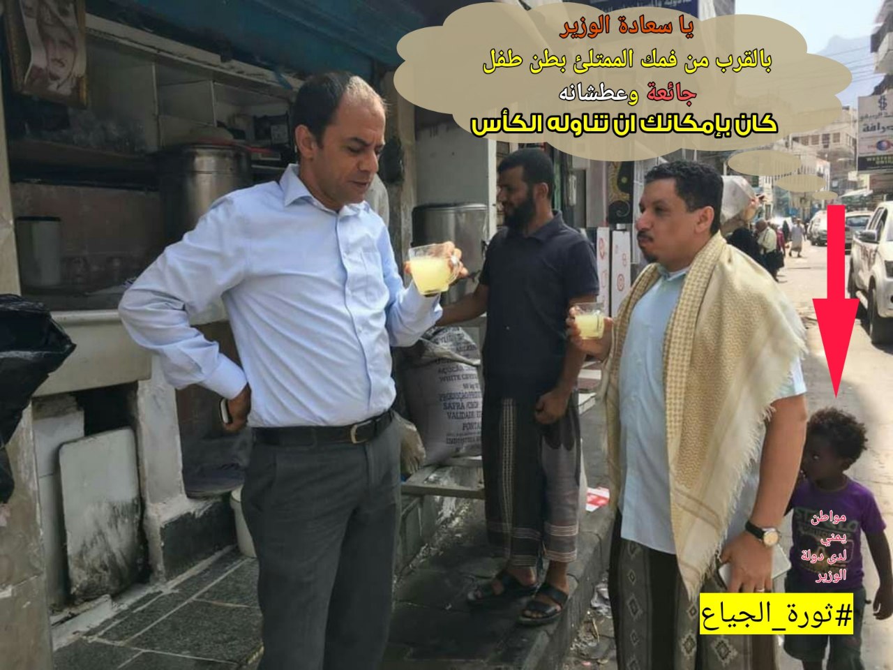 وكتبوا على صورة الوزير وأعين الحسرة والضعف والتشرد تمرق الوزير وهو يرتشف كأسا من العصير ” يا سعادة الوزير بالقرب من فمك الممتلئ بطن طفل جائعة وعطشانه .. كان بإمكانك أن تناوله الكأس ” في تعبير واضح على مدى الغضب الذي ساد رواد مواقع التواصل الاجتماعي جراء تلك الصورة المؤلمة التي عرت حقيقة أعضاء حكومة هادي .