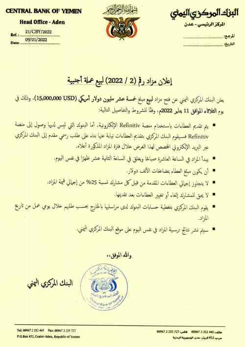 يعلن البنك المركزي اليمني عن فتح مزاد لبيع مبلغ خمسة عشر مليون دولار أمريكي (15,000,000 USD)، وذلك في يوم الثلاثاء الموافق 11 يناير 2022م، وفقًا للشروط والتفاصيل التالية:
