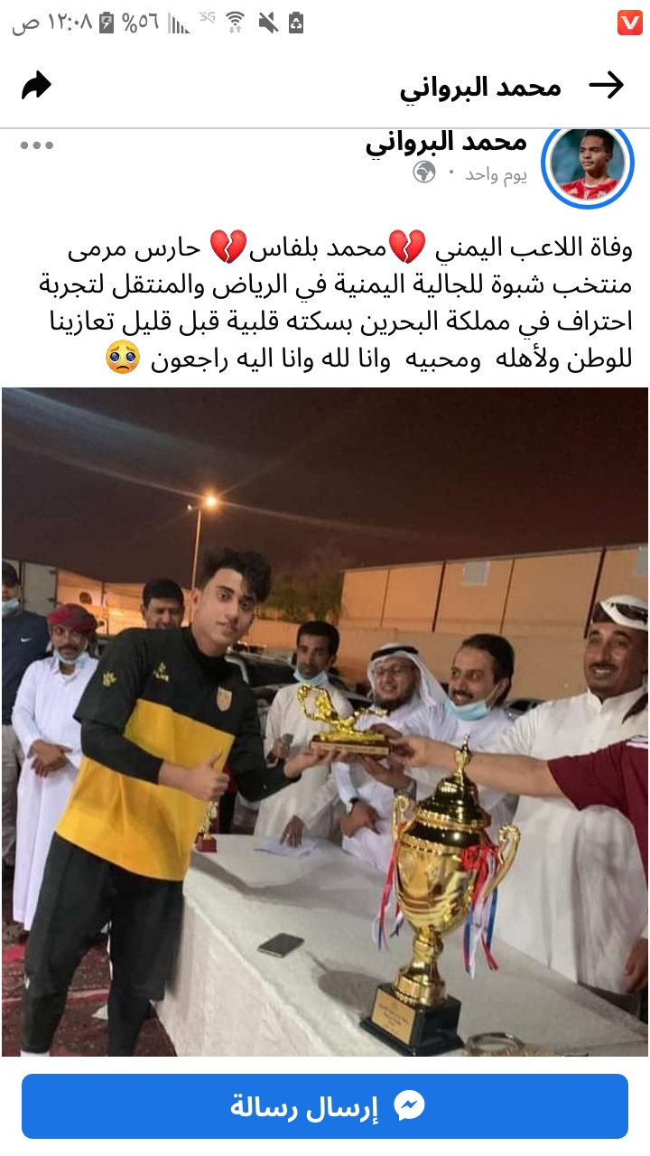 وفاة اللاعب اليمني محمد بلفاس حارس مرمى منتخب شبوة للجالية اليمنية في الرياض والمنتقل لتجربة احتراف في مملكة البحرين بسكته قلبية قبل قليل تعازينا للوطن ولأهله ومحبيه وانا لله وانا اليه راجعون.