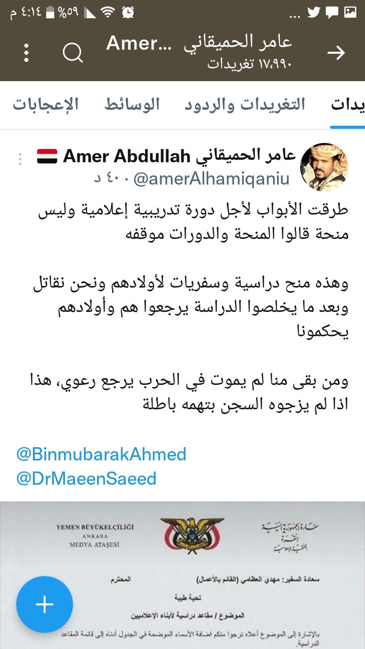 وقال الناطق الرسمي باسم مقاومة البيضاء عامر الحميقاني في تغريدة على حسابه الرسمي بموقع تويتر. :”طرقت الأبواب لأجل دورة تدريبية إعلامية وليس منحة قالوا المنحة والدورات موقفه وهذه منح دراسية وسفريات لأولادهم..