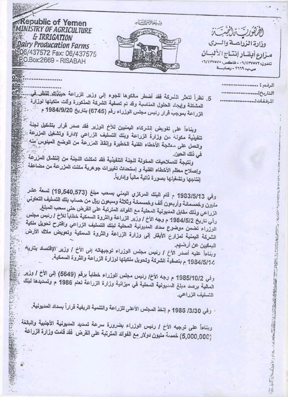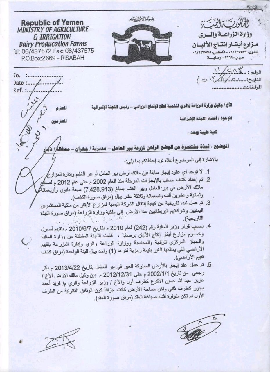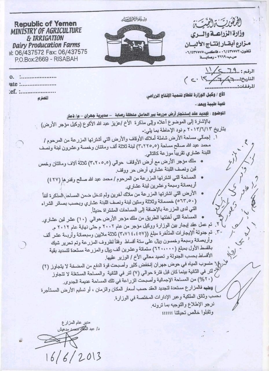 ولعل أهم ماتكشفه الوثائق المرفقة من الإحتيال والتلاعب بأراضي المزارع هو ما أوردتة التقارير من أن مساحة المزرعة حسب التقديرات تقارب 17000 لبنة ( تعتبر أسعار الأراضي في رصابه وقاع جهران الأغلی في اليمن ) … فقط منها 427 لبنه اشترتها المزرعة من ورثة / محمد عبدالله صالح الاحمر حسب ما ذكر بالوثائق والمساحة المتبقيه مقسمة مابين الحكومه اليمنية ووزارة الأوقاف وعلي عبدالله صالح وأحمد الغشمي.