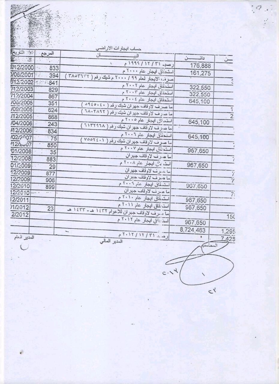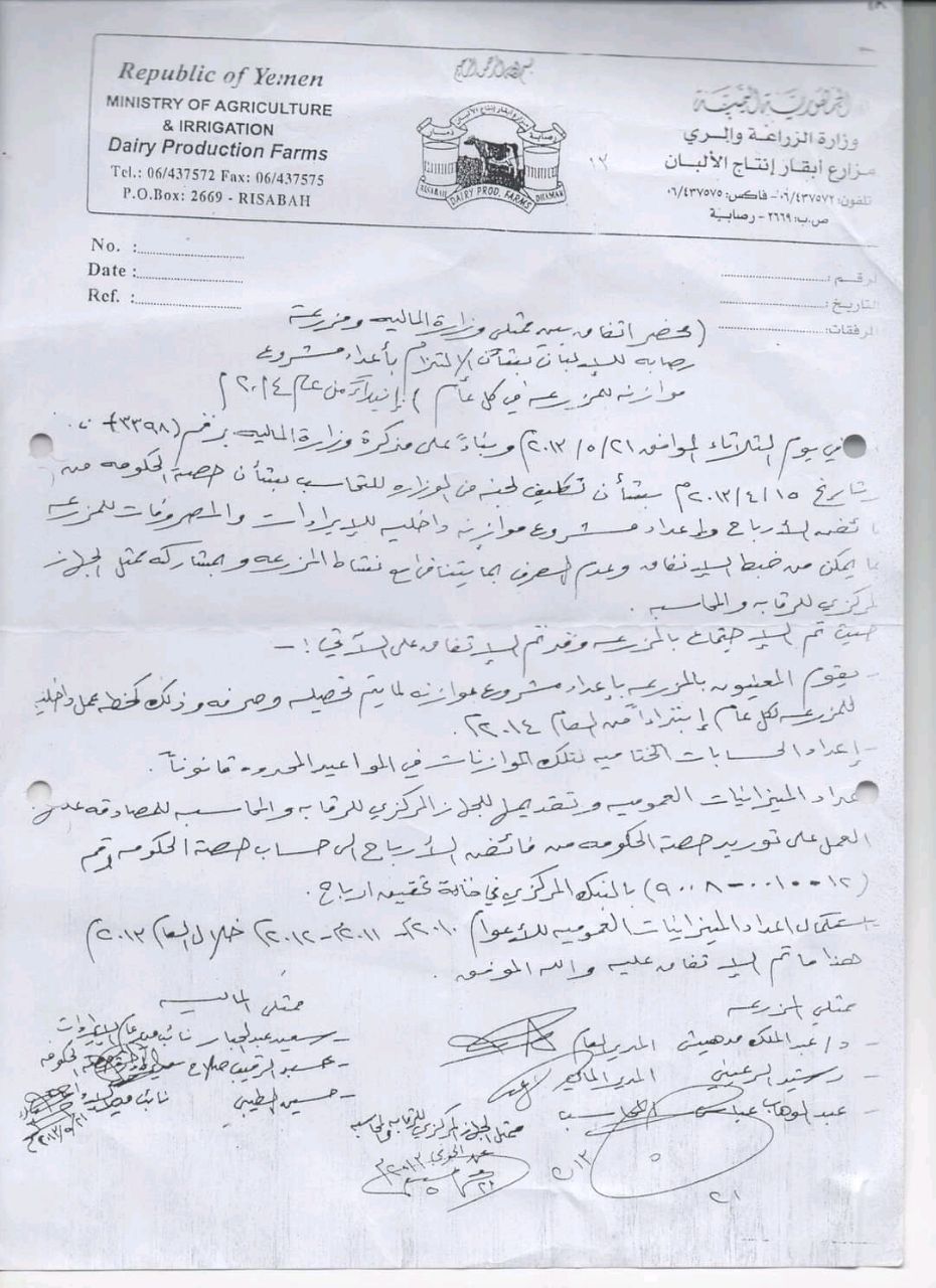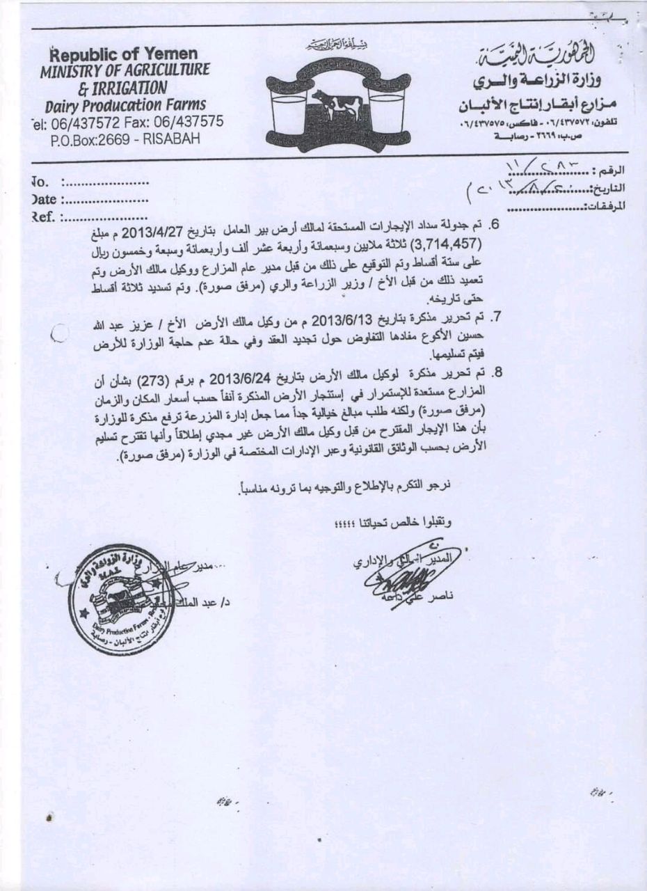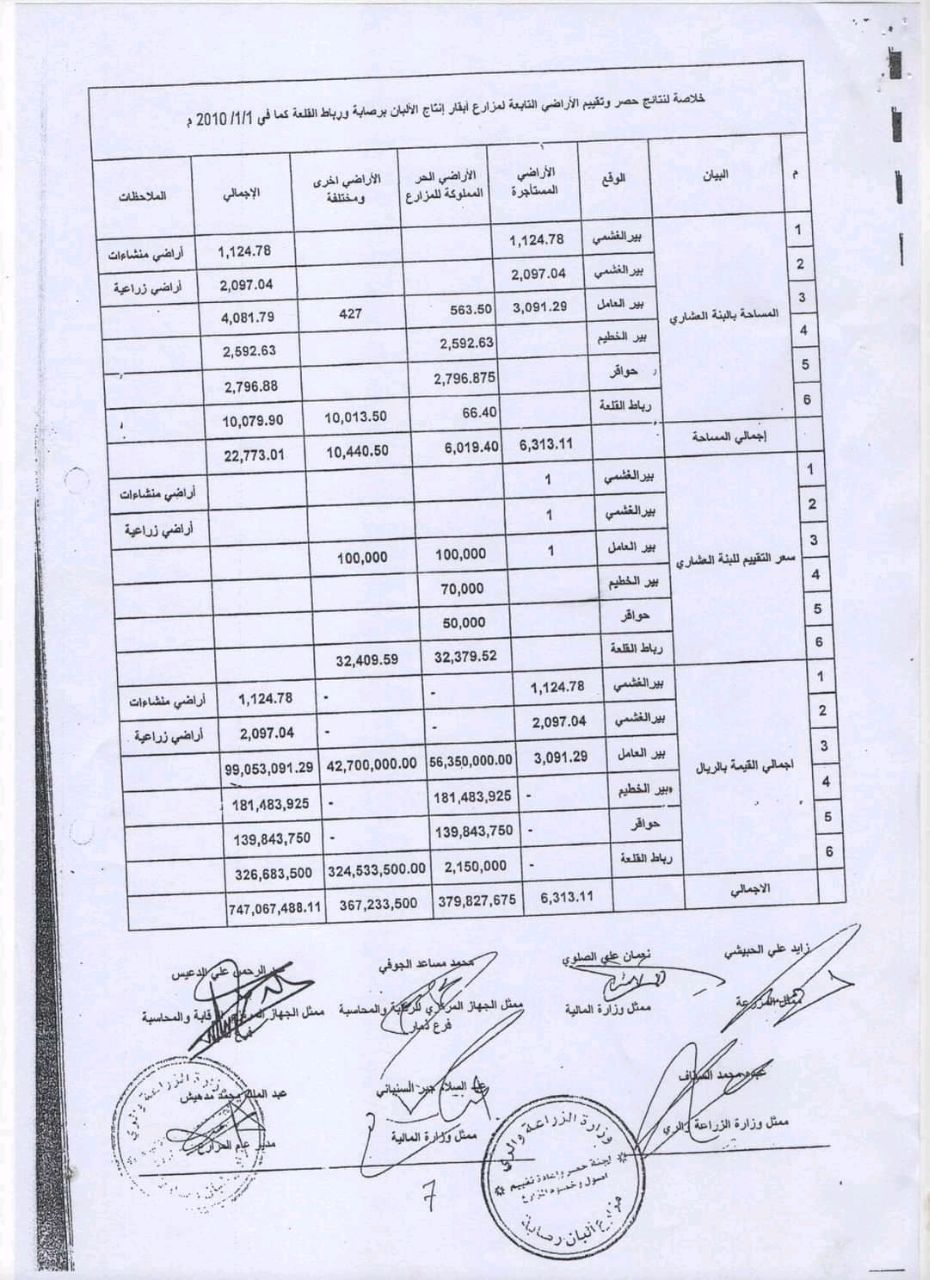 ولعل أهم ماتكشفه الوثائق المرفقة من الإحتيال والتلاعب بأراضي المزارع هو ما أوردتة التقارير من أن مساحة المزرعة حسب التقديرات تقارب 17000 لبنة ( تعتبر أسعار الأراضي في رصابه وقاع جهران الأغلی في اليمن ) … فقط منها 427 لبنه اشترتها المزرعة من ورثة / محمد عبدالله صالح الاحمر حسب ما ذكر بالوثائق والمساحة المتبقيه مقسمة مابين الحكومه اليمنية ووزارة الأوقاف وعلي عبدالله صالح وأحمد الغشمي.