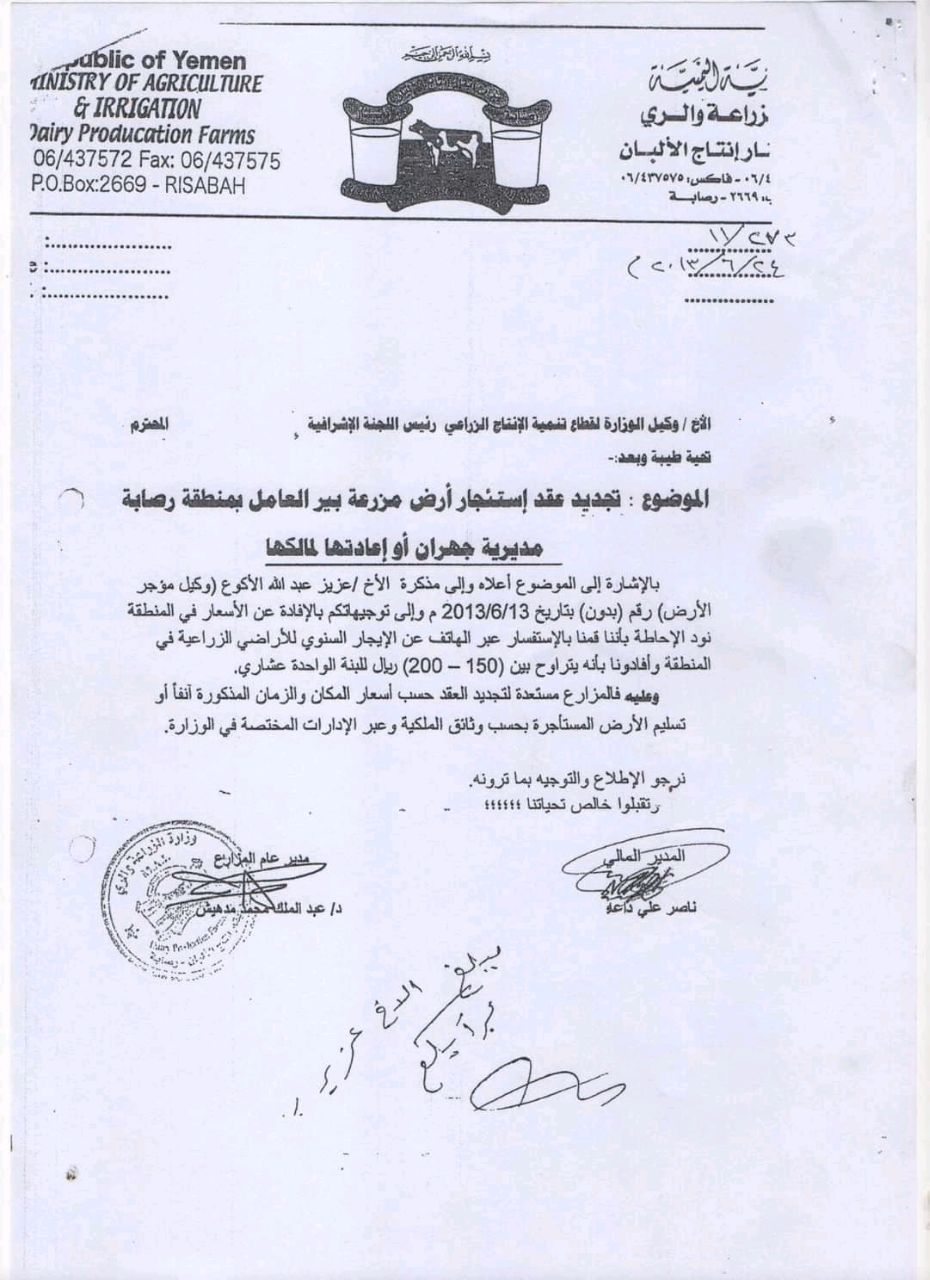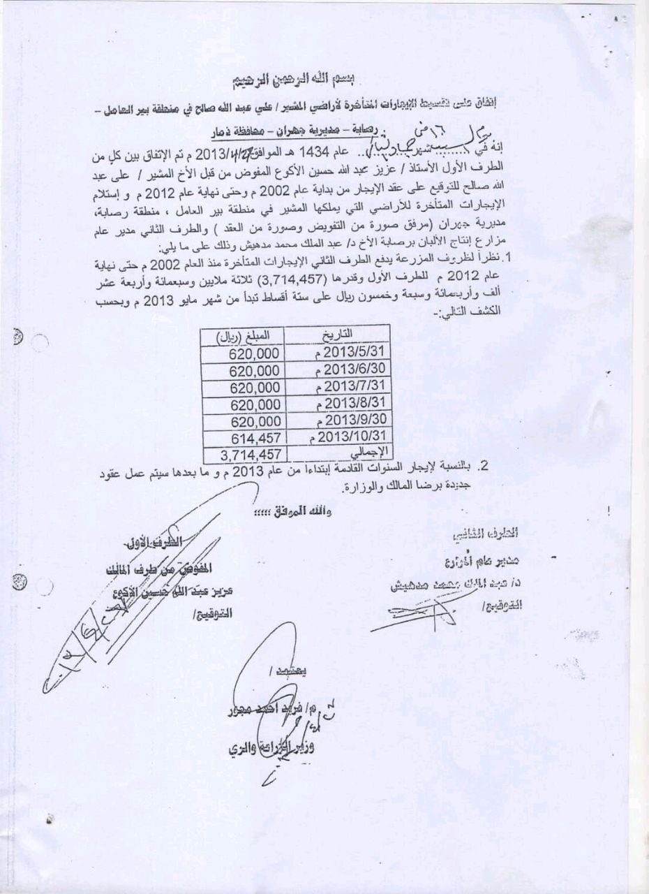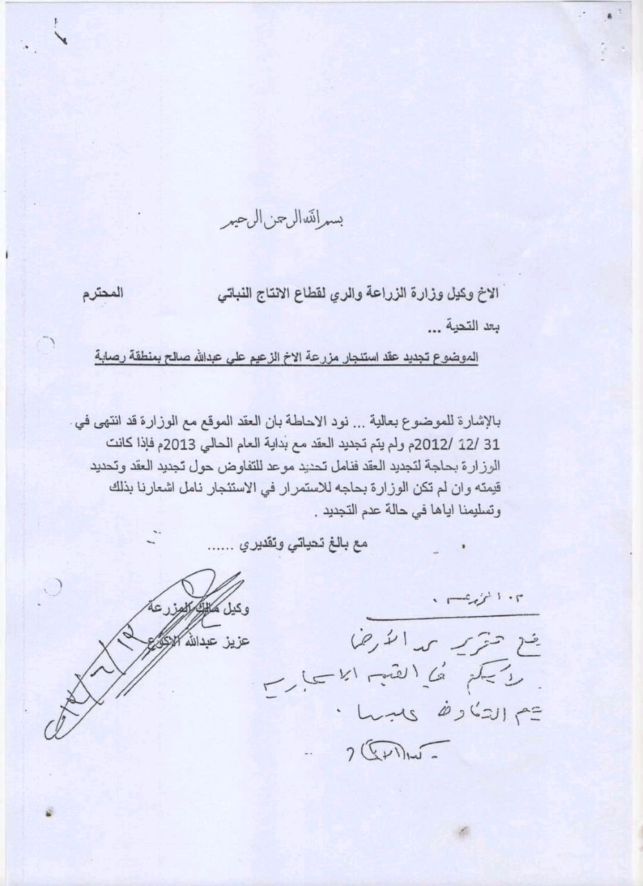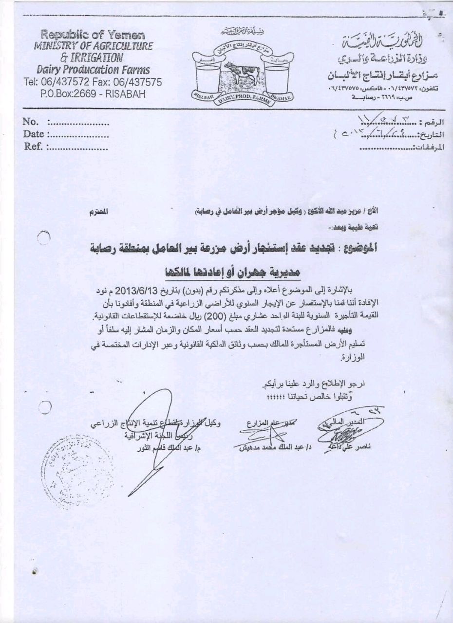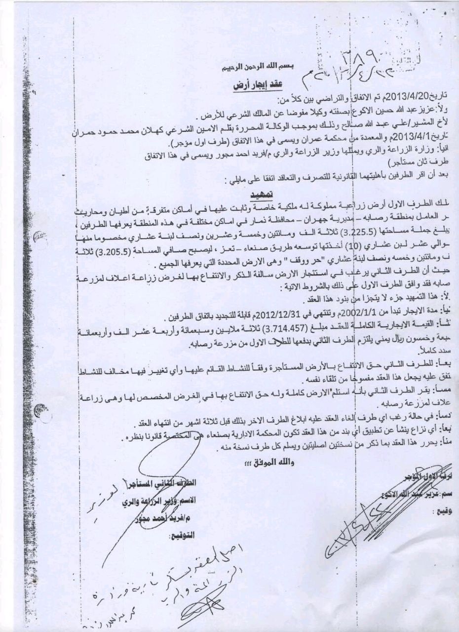 وفجأة وبعد أقل من شهر من توقيع الإتفاق وجه الرئيس السابق علي صالح عبر وكيله عزيز الأكوع طلبا إلی الحكومة ممثلة بوزارة الزراعة ( ووزيرها فريد مجور من حزب المؤتمر ) بتجديد عقد الايجار لمزرعة علي عبدالله صالح برصابة بعد انتهاء العقد السابق نهاية العام 2012 حسب ماورد بالمذكرة… والغريب أنه تمت الموافقه علی تجديد العقد بأثر رجعي لأحد عشرة سنة تبدأ في أول يناير 2002 كما يكشف عقد الإيجار المذكور بموجب وكالة شرعية للمدعو عزيز الأكوع دون تقديم أي وثائق لإثبات الملكية وقتها.
