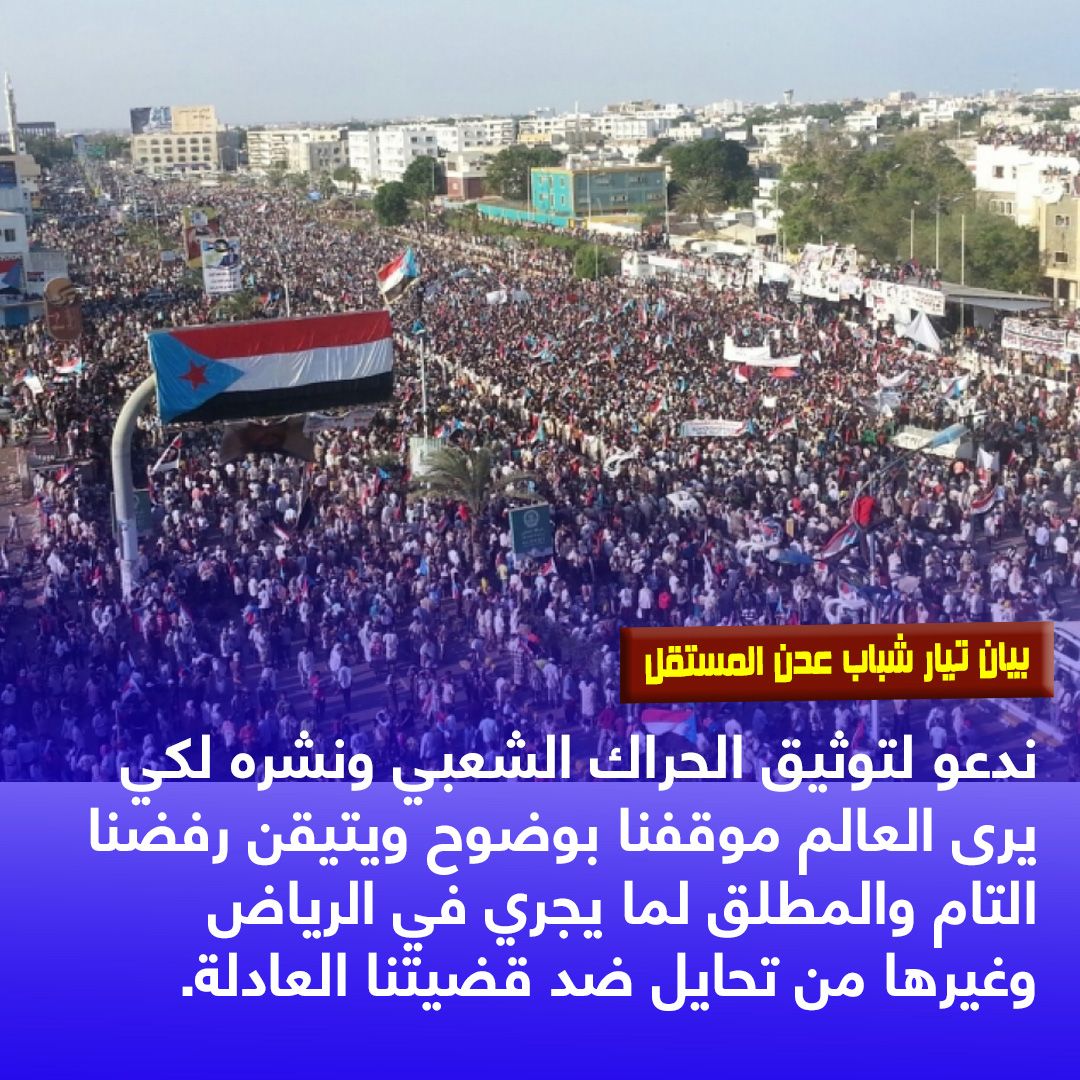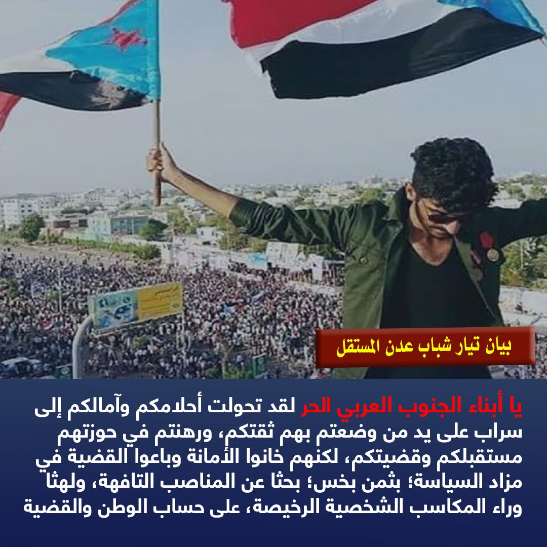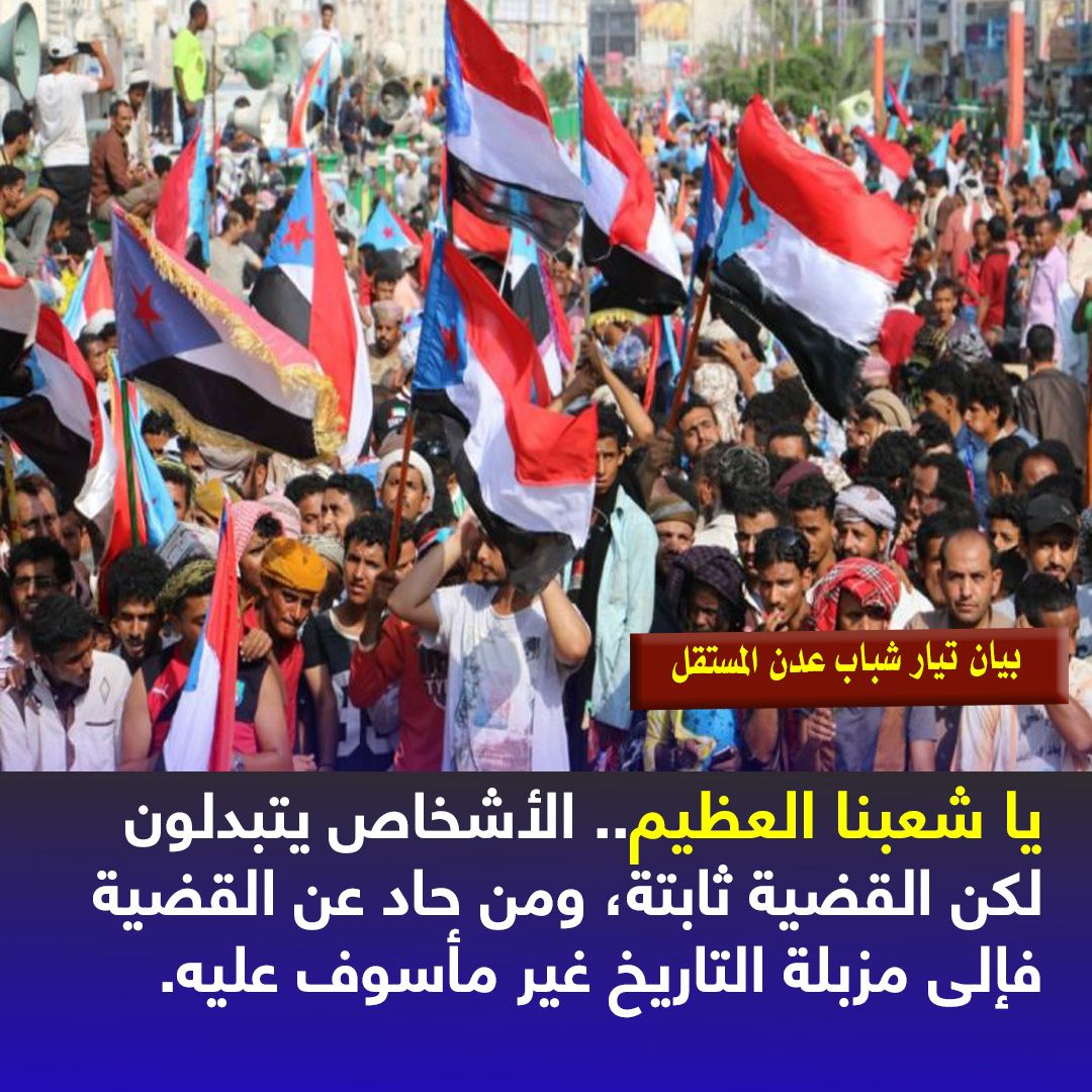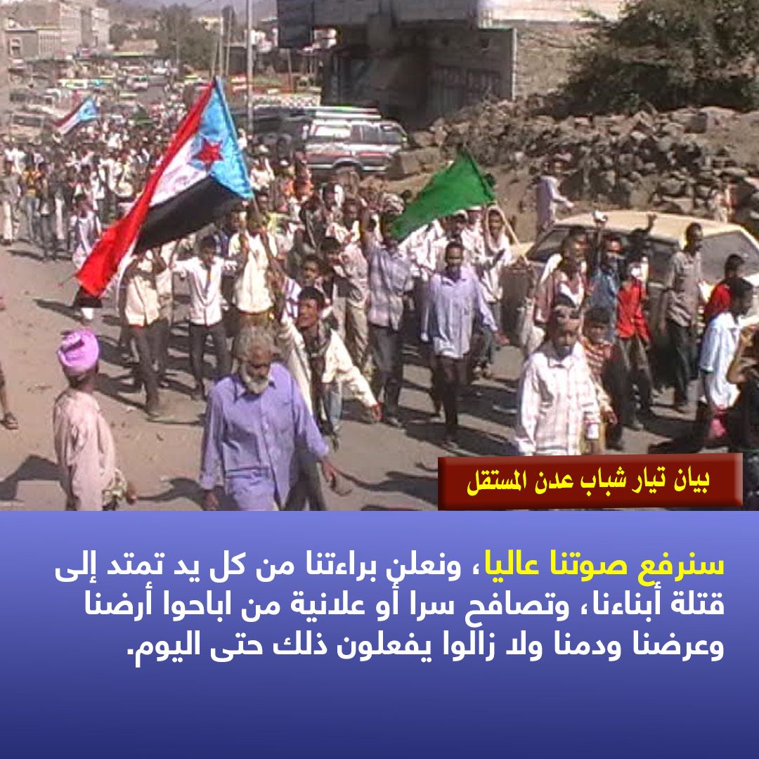 وابتداء من هذه الساعة نعلن نحن تيار “شباب عدن المستقل” انطلاق نضالنا الوطني المشروع في استعادة دولة الجنوب بكل السبل المشروعة من أجل الجنوب فقط وفقط وفقط.