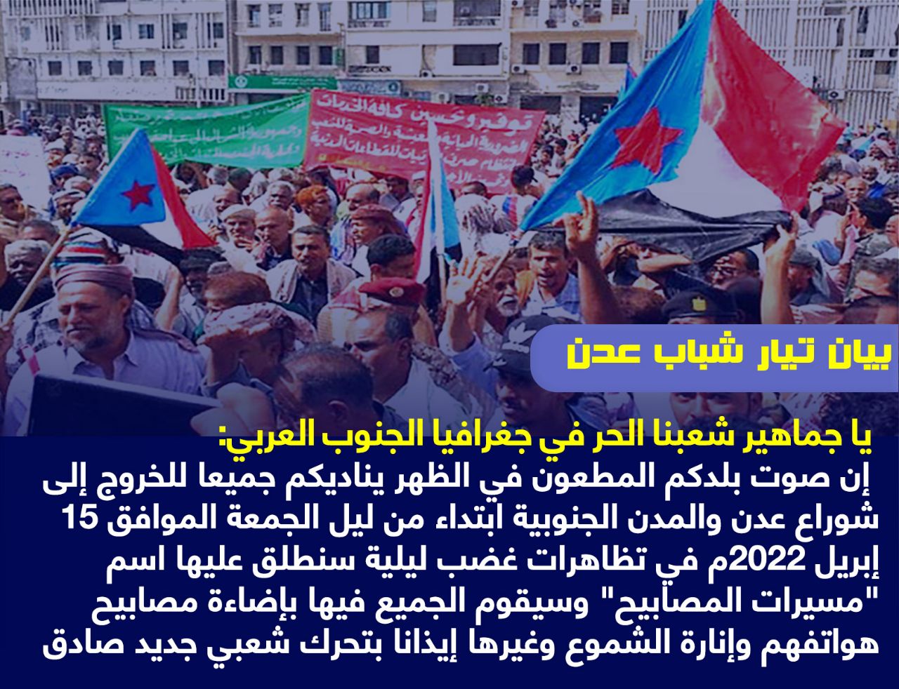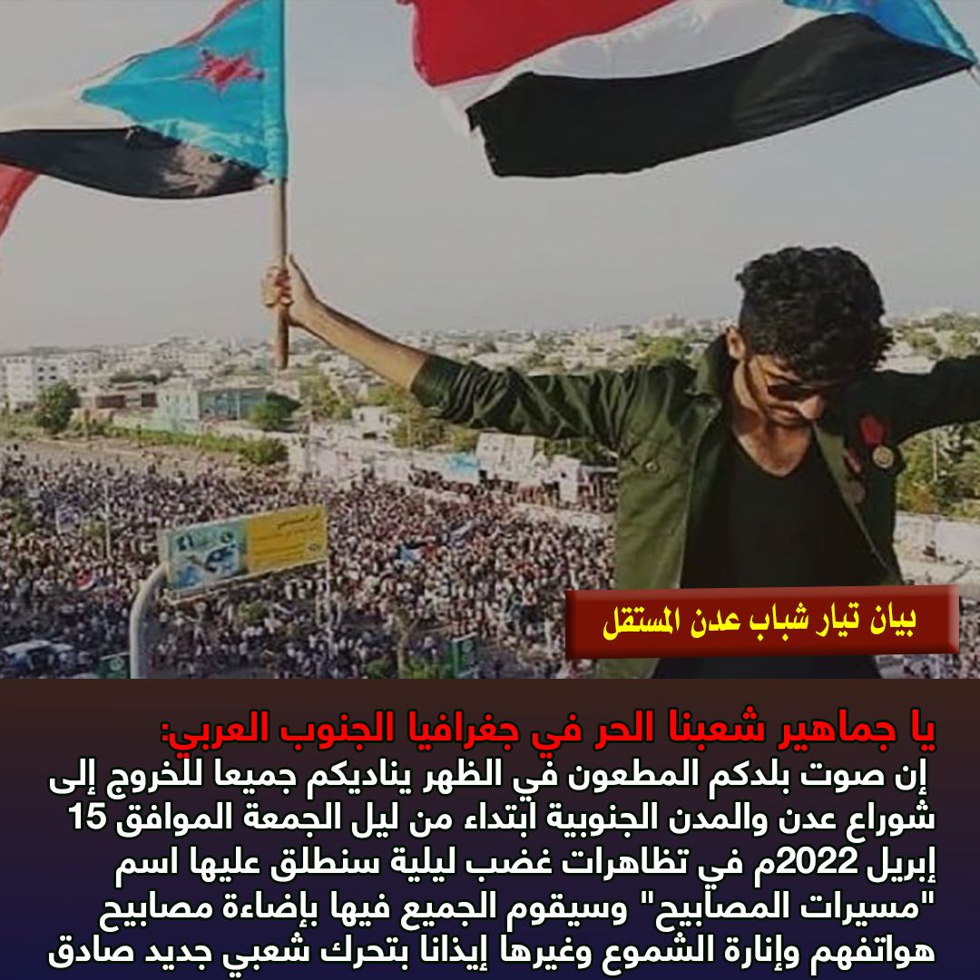 إن صوت بلدكم المطعون في الظهر يناديكم جميعا للخروج إلى شوراع عدن والمدن الجنوبية ابتداء من ليل الجمعة الموافق 15 إبريل 2022م في تظاهرات غضب ليلية سنطلق عليها اسم “مسيرات المصابيح” وسيقوم الجميع فيها بإضاءة مصابيح هواتفهم وإنارة الشموع إيذانا بتحرك مختلف، وتوثيق الحراك الشعبي ونشره لكي يرى العالم موقفنا بوضوح ويتيقن رفضنا التام والمطلق لما يجري في الرياض وغيرها من تحايل ضد قضيتنا العادلة.