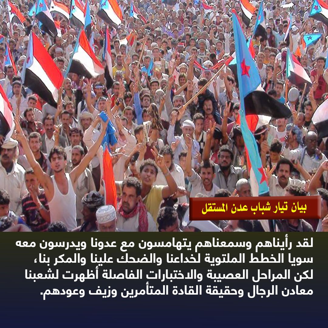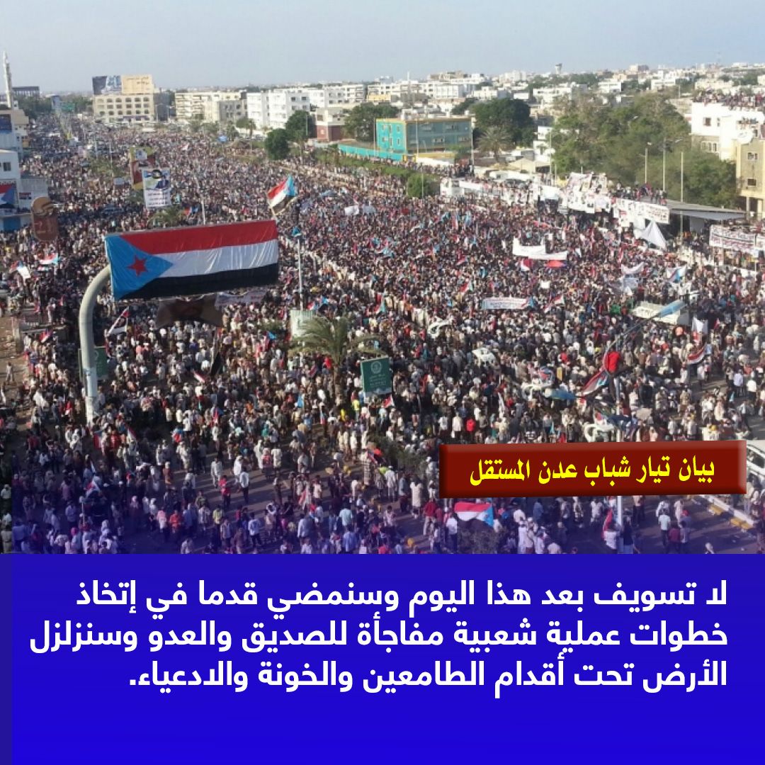 وقال تيار شباب عدن المستقل في بيان صدر عنه مساء اليوم :” لا تسويف بعد هذا اليوم، ولا ارتهان لوصاية احد سنمضي قدما في رفض الاتجار بقضيتنا ورفض التدخلات الخارجية وفي إتخاذ خطوات عملية شعبية مفاجأة للصديق والعدو وسنزلزل الأرض تحت أقدام الادعياء والمتاجرين والخونة والطامعين.