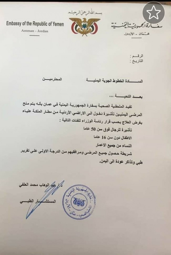 وأوضح المستشار الطبي بالسفارة، في مذكرة وجهها للخطوط الجوية اليمنية. إفادة الملحقية الصحفية في السفارة بمنح المرضى اليمنيين تأشيرة دخول إلى الأردن عبر مطار الملكة علياء لغرض العلاج بحسب قرار رئاسة الوزراء.