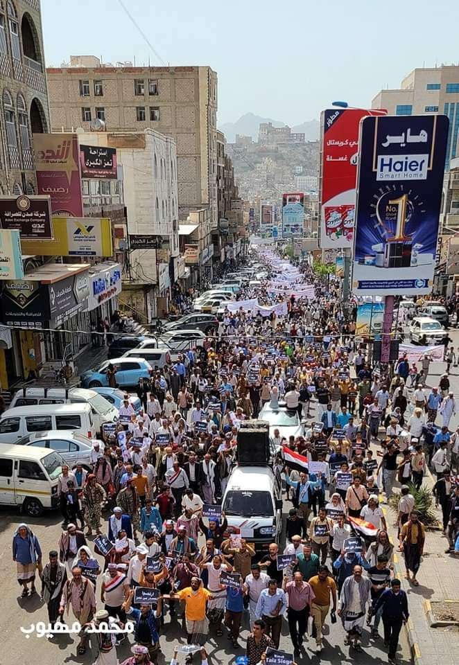 توافد الآلاف من أبناء تعز صباح اليوم الأربعاء إلى شوارع المدينة للمشاركة في تظاهرات تطالب بالضغط على طارق صالح وجماعة الحوثي والقوات الحكومية لفتح طرقات تعز المغلقة منذ نحو سبعة أعوام.