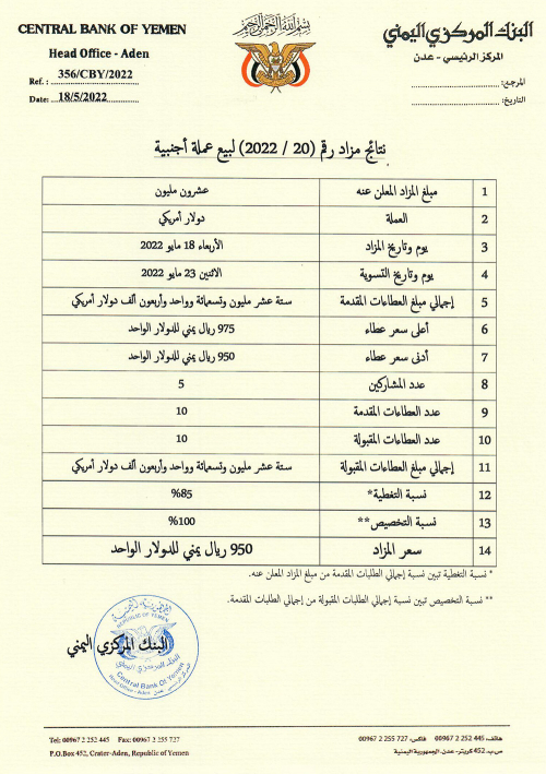 من جهته، أعلن البنك المركزي اليمني اليوم الأربعاء الموافق 18 مايو 2022م، عن نتائج المزاد رقم (20-2022) لبيع عملة أجنبية، والتي أعلن عنها يوم الأحد الماضي.