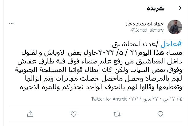جاء ذلك في تغريدة، نشرها القيادي في الانتقالي جهاد الشاعري، السبت الفائت قال فيها: “مساء هذا اليوم 21 مايو حاول بعض الاوباش والفلول داخل المعاشيق رفع علم صنعاء فوق فلة طارق عفاش وفوق بعض البنيات. لكن ابطالنا كانوا لهم بالمرصاد وحصل ماحصل.حصلت مهاترات وتم انزال الأعلام وتقطيعها وقالوا لهم بالحرف الواحد نحذركم وللمرة الاخيرة”.