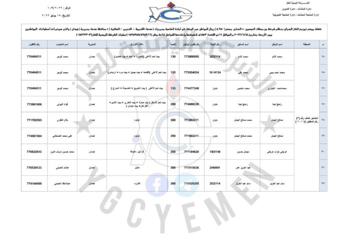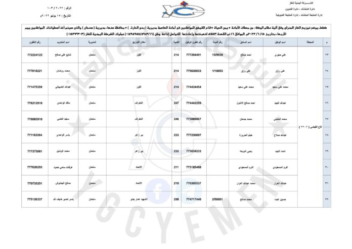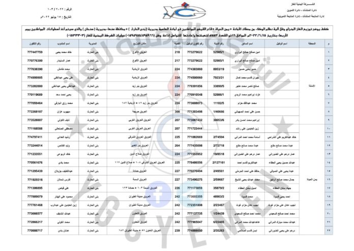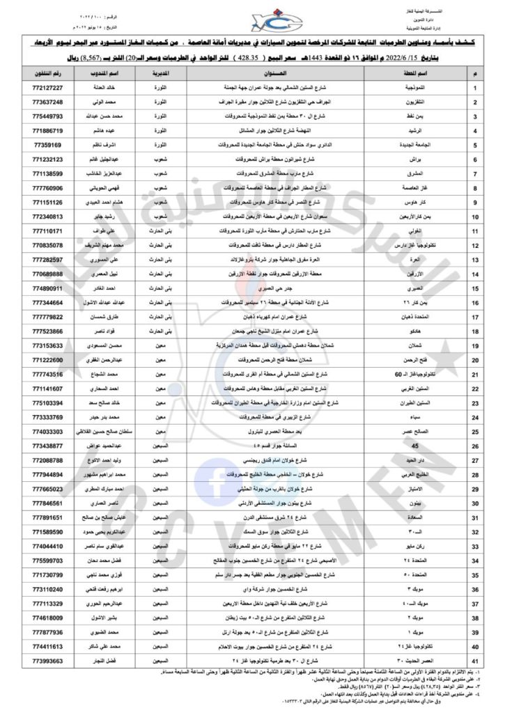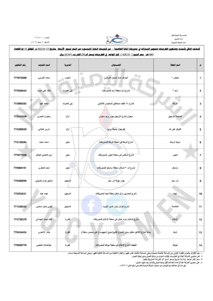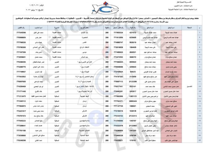 موقع “مجتهد نيوز” ينشر لكم كشوفات محطات تعبئة السيارات الحصص الموزعة على عقال الحارات في صنعاء ليوم غداً الأربعاء 15 يونيو 2022م :