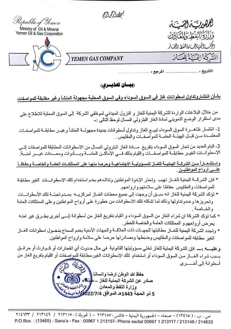 3_ تؤكد الشركة اليمنية للغاز إنه سبــق أن وجهت إلى جميع محطات الغــاز المركزيه بعــدم تعبئــة تلك الأسطوانـــات. وتحريزها وعـدم تداولها وذلك لما تشكله تلك الاسطوانات من خطورة على أرواح المواطنين وعلى الممتلكات العامة والخــاصة.