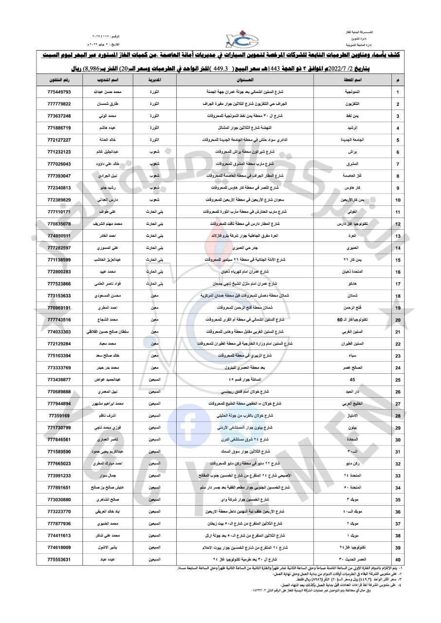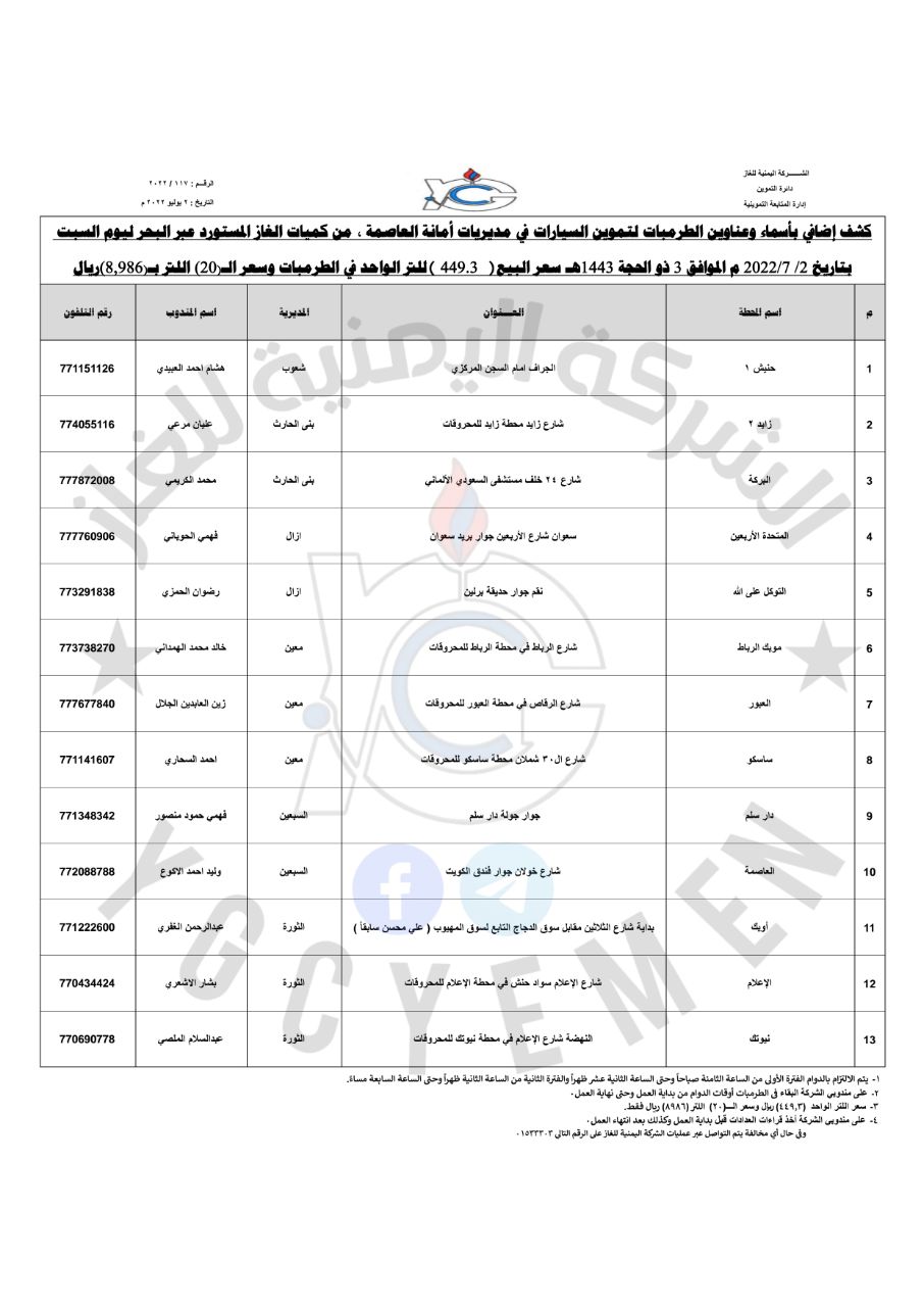 كما نشرت الشركة اليمنية للغاز عبر صفحاتها الرسمية على مواقع التواصل الإجتماعي، كشف بأسماء وعناوين الطرمبات لتموين السيارات في مديريات أمانة العاصمة صنعاء من كميات الغاز المستورد عبر البحر حيث أن سعر اللتر الواحد بـ ( ٤٤٩.٣ ريال ) والـ ٢٠ لتر بـ ( ٨,٩٨٦ ريال ).