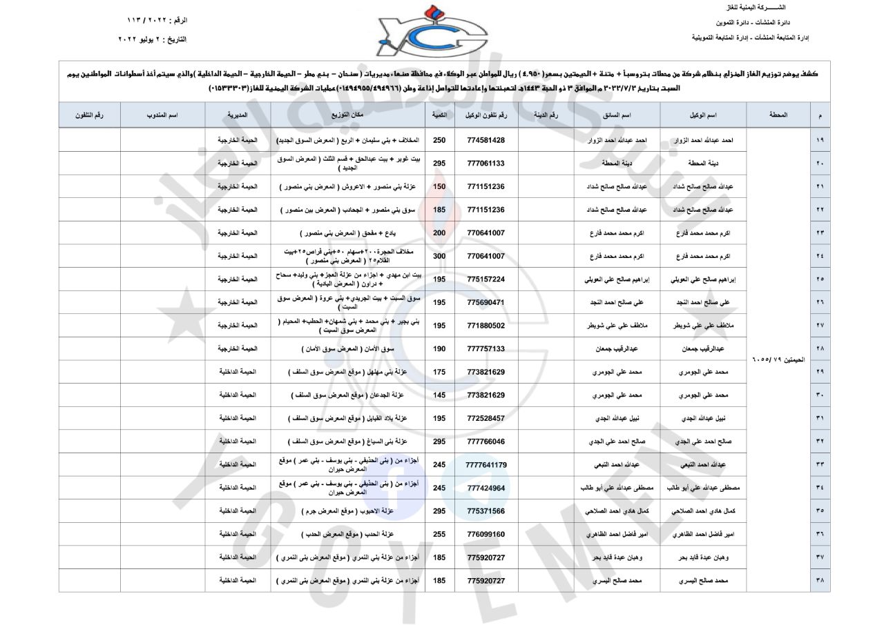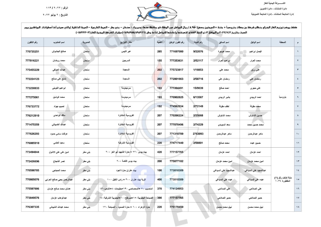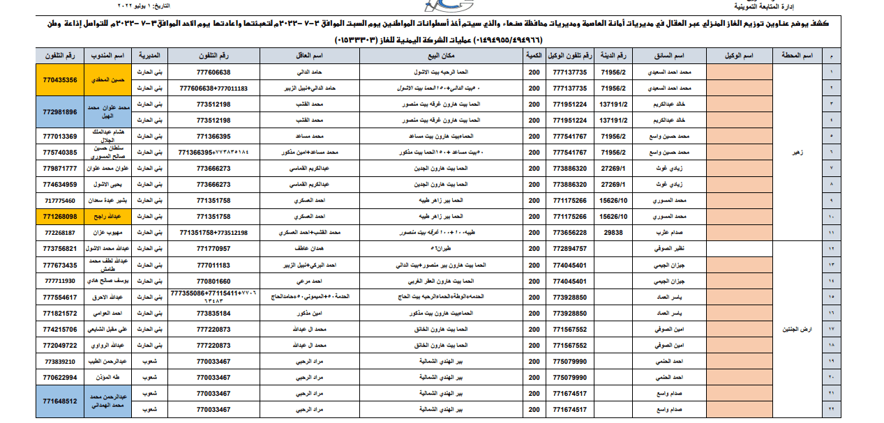 بالإضافة إلى كشف توزيع الغاز للحارات “نظام شركة” لمديريات ( سنحان – بني مطر – الحيمة الداخلية – الحيمة الخارجية ) بمحافظة صنعاء، وسعر الأسطوانة بـ ( ٤,٩٥٠ ريال ).. وكشف توزيع الغاز للحارات ” نظام وكلاء ” لمديريات ( الصافية – التحرير – صنعاء القديمة – بني الحارث) في أمانة العاصمة وبسعر ( ٥٩٠٠ ريال).
