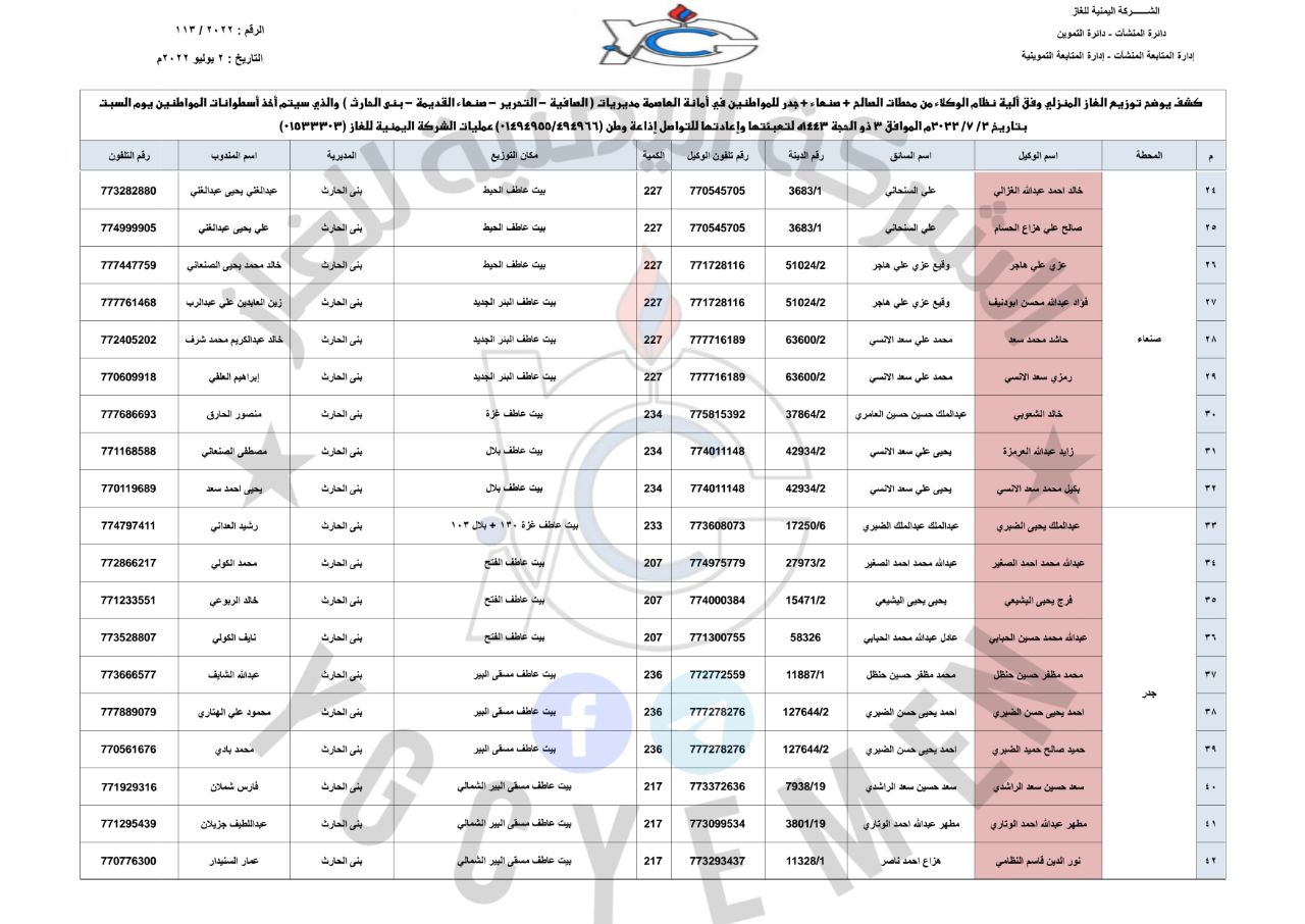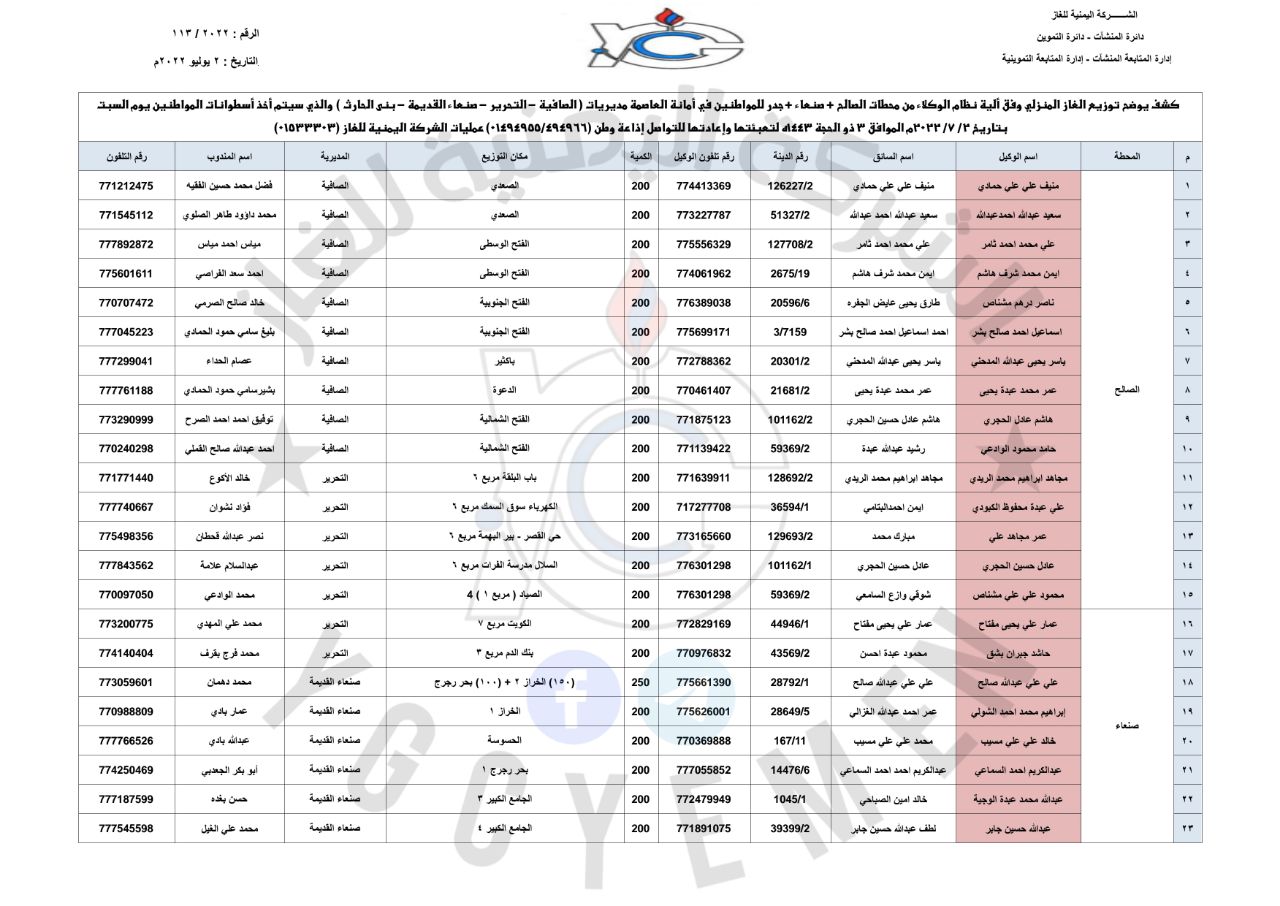 نشرت شركة الغاز بصنعاء ، قبل قليل، كشوفات توزيع أسطوانات الغاز المنزلي عبر عقال الحارات في مديريات أمانة العاصمة ومحافظة صنعاء ليوم غداً السبت الموافق 2 يوليو 2022م وبسعر “5900” ريال.
