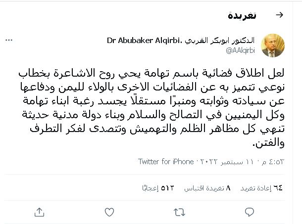 القربي قال في تغريدته: “لعل إطلاق فضائية باسم تهامة يحي روح الاشاعرة بخطاب نوعي تتميز به عن الفضائيات الأخرى بالولاء لليمن ودفاعها عن سيادته وثوابته ومنبراً مستقلاً يجسد رغبة أبناء تهامة وكل اليمنيين في التصالح والسلام وبناء دولة مدنية حديثة تنهي كل مظاهر الظلم والتهميش وتتصدى لفكر التطرف والفتن”.