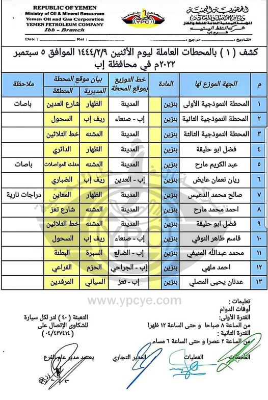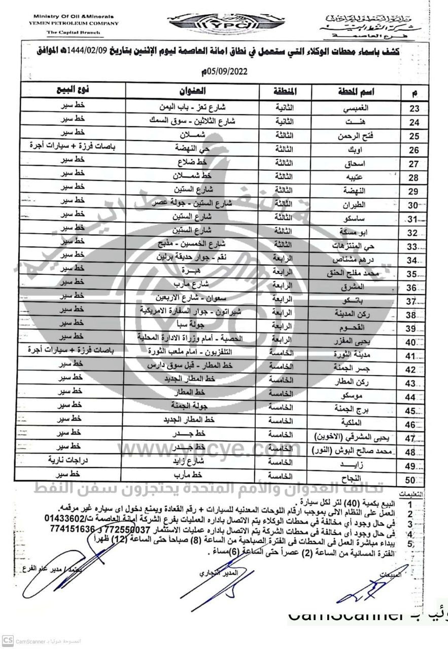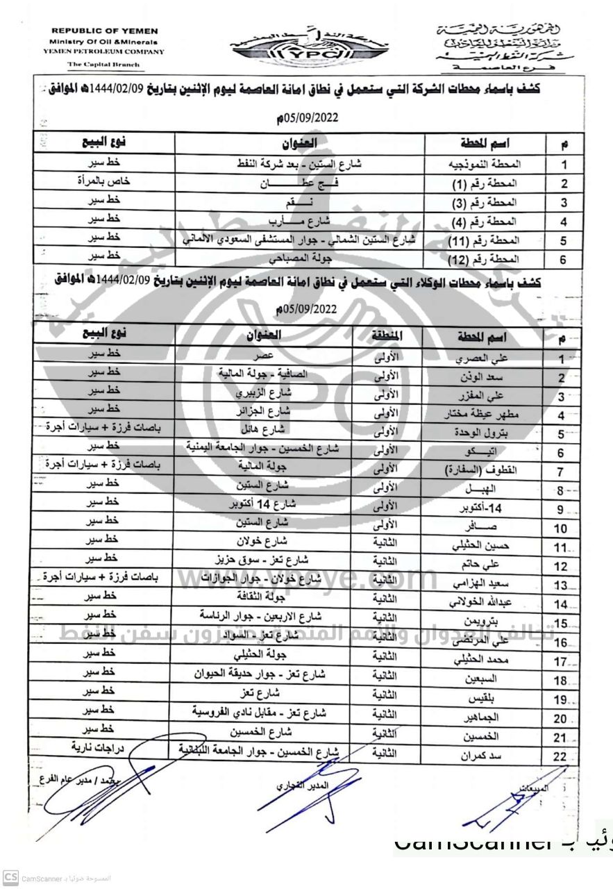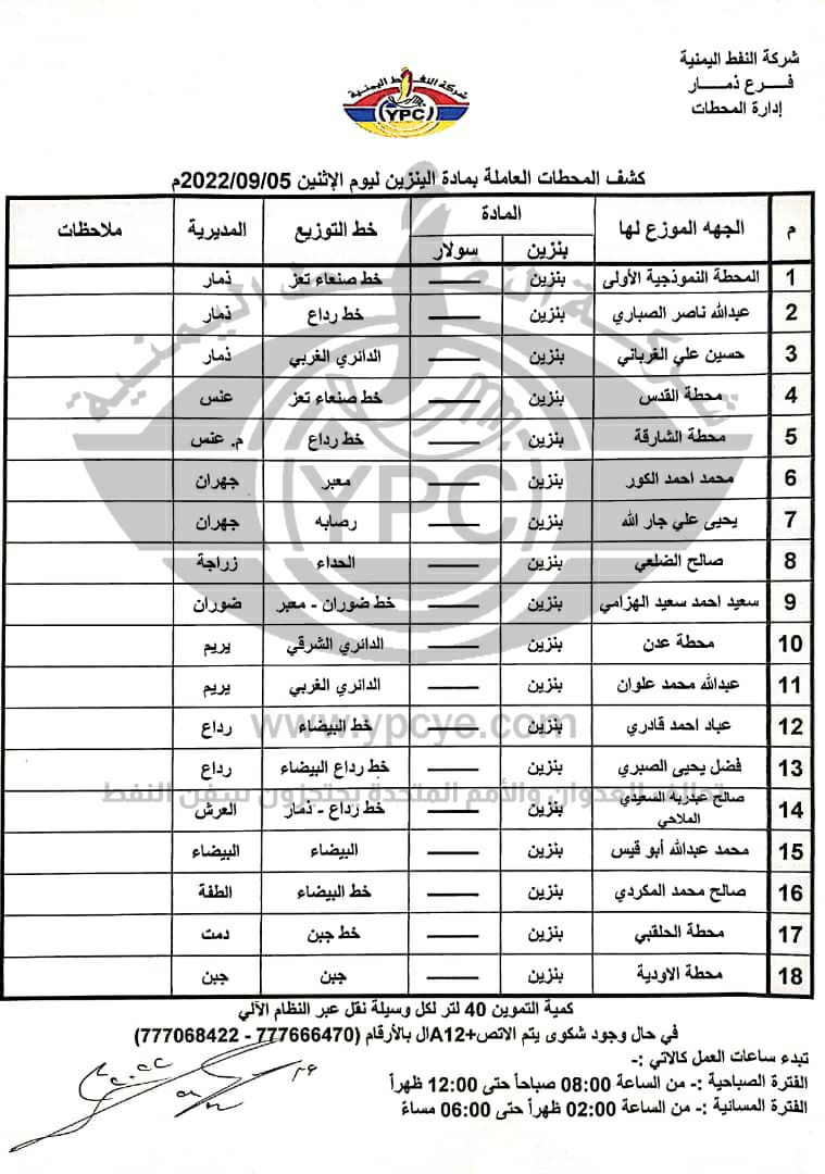 ونشرت الشركة كشوفات أسماء محطات توزيع البترول والديزل ليوم الاثنين 5 سبتمبر 2022 العاملة بالسعر الرسمي في أمانة العاصمة صنعاء وبقية المحافظات.
