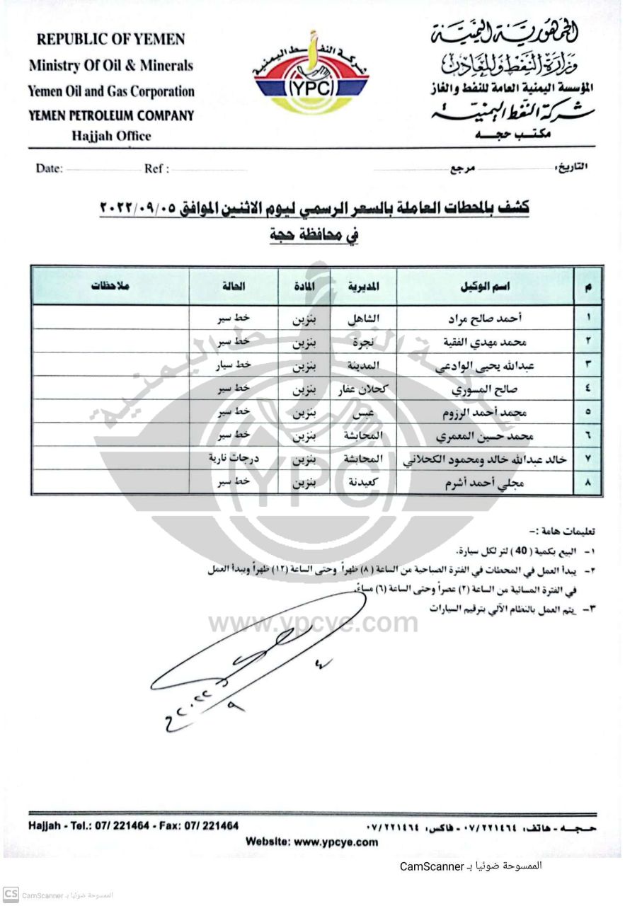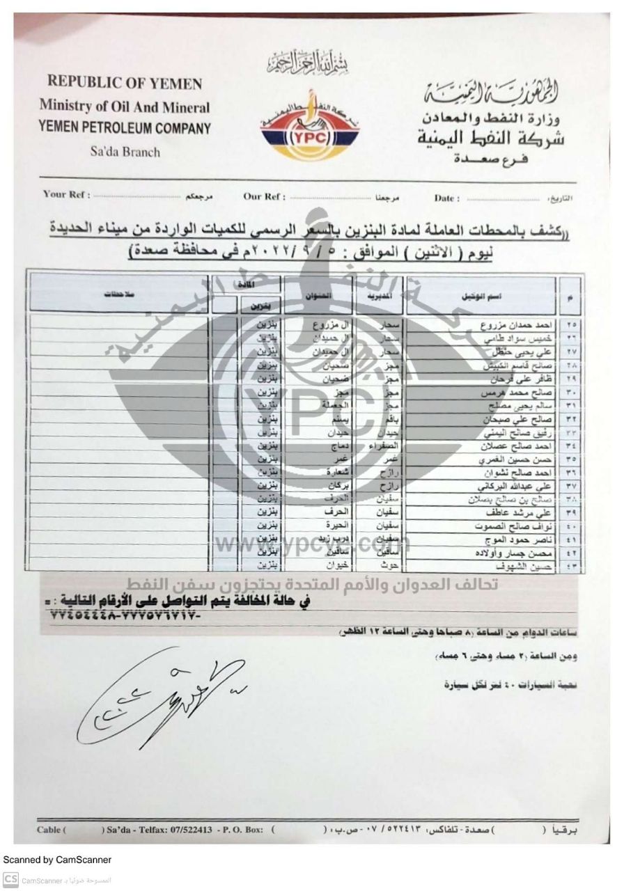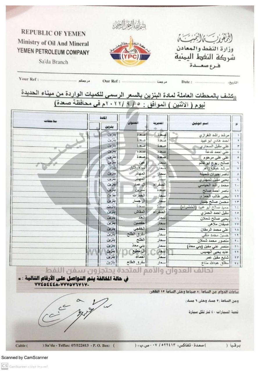 ونشرت الشركة كشوفات أسماء محطات توزيع البترول والديزل ليوم الاثنين 5 سبتمبر 2022 العاملة بالسعر الرسمي في أمانة العاصمة صنعاء وبقية المحافظات.