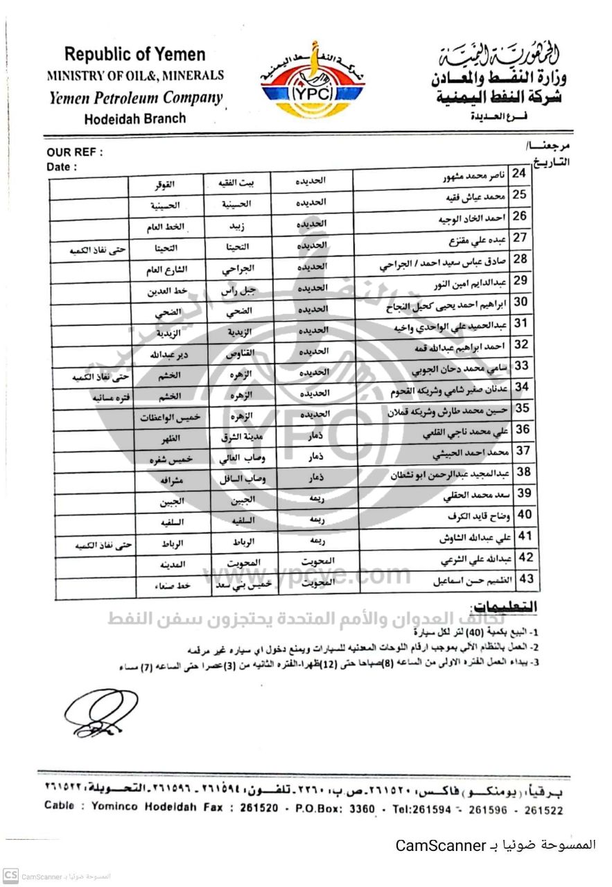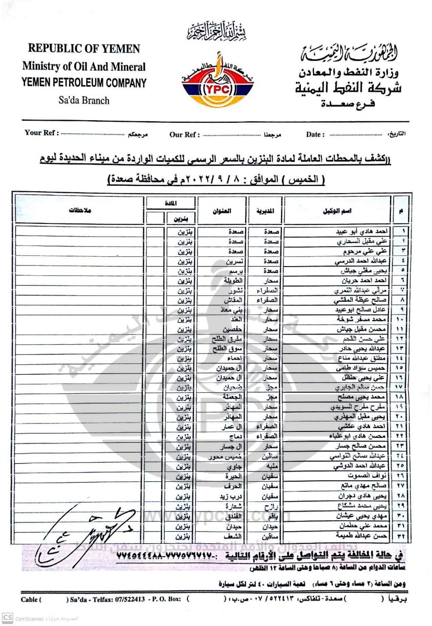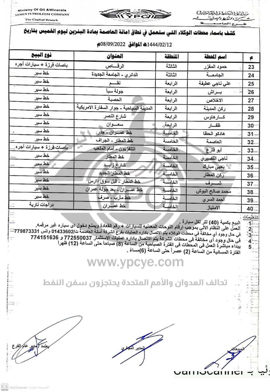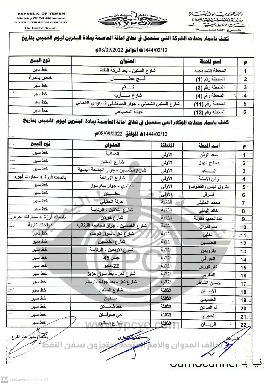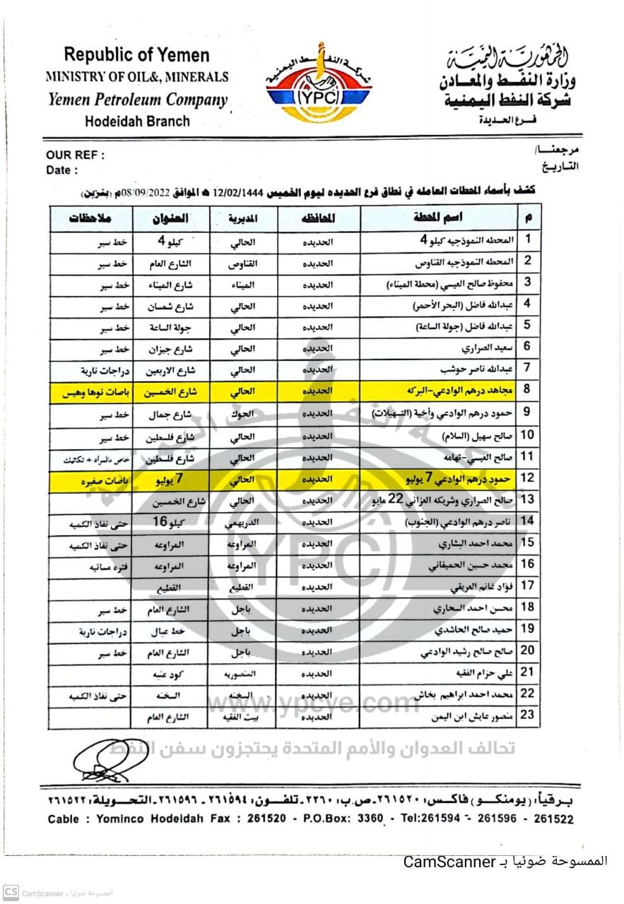 ونشرت الشركة كشوفات أسماء محطات توزيع البترول والديزل ليوم غداً الخميس الموافق 8سبتمبر 2022 العاملة بالسعر الرسمي في أمانة العاصمة صنعاء وبقية المحافظات.