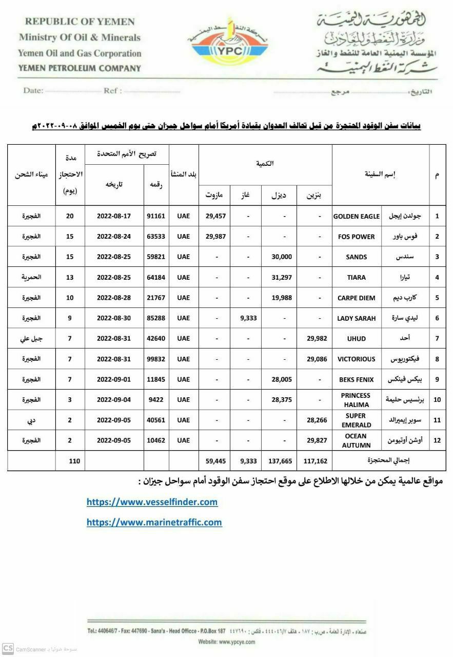يشار إلى أن شركة النفط اليمنية قد أعلنت في وقت سابق، في بيان لها “اضطرارها للعمل بخطة الطوارئ بسبب استمرار التحالف (بقيادة السعودية) باحتجاز سفن النفط التي بلغت تسع سفن وما سببه ذلك من أزمة تموينية متعمدة”.