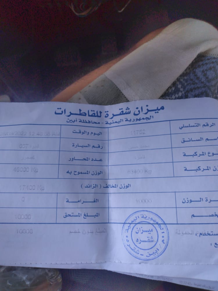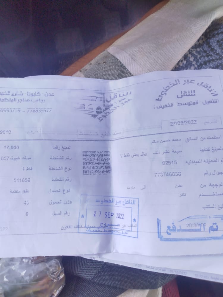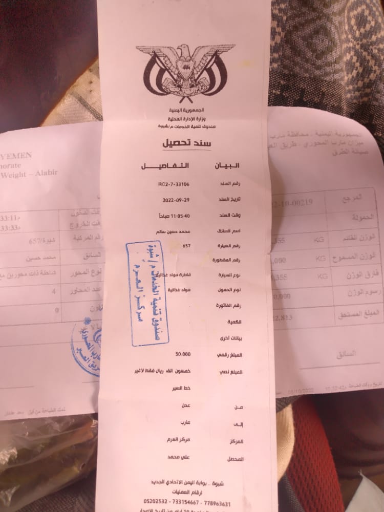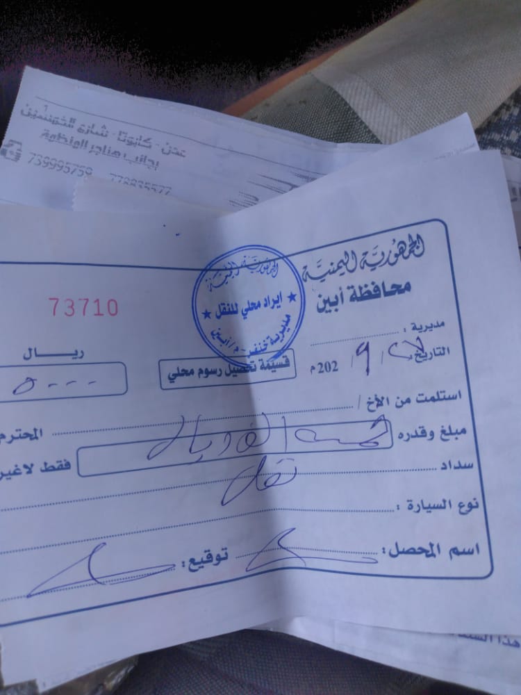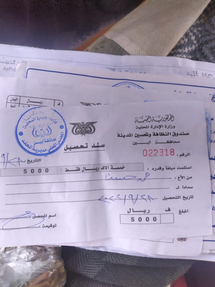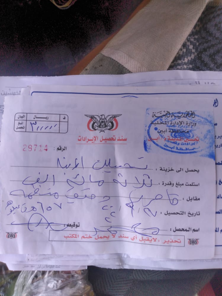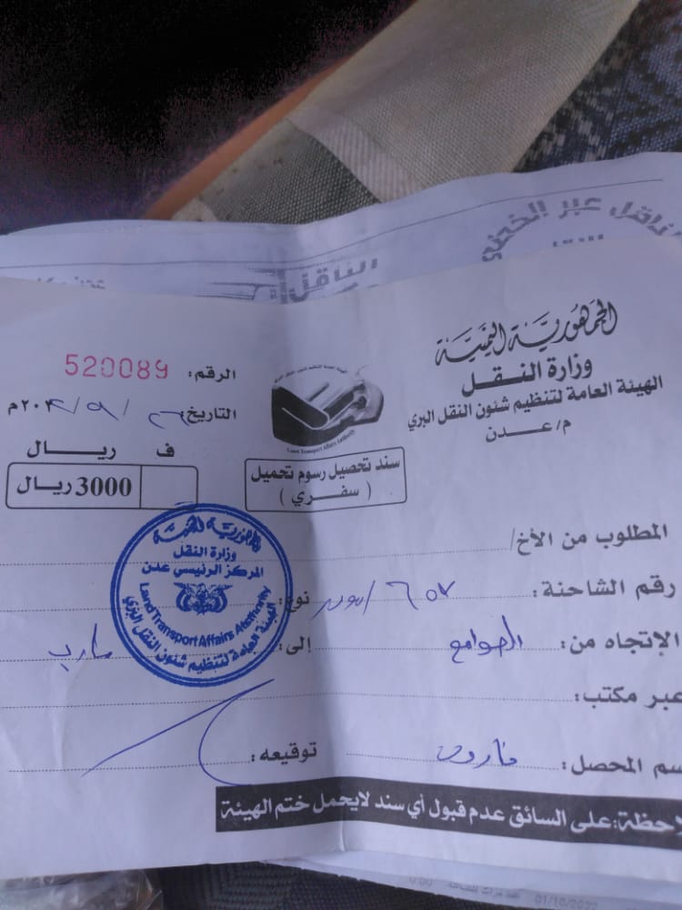 وانتشرت صور سندات تحصيل بمبالغ مالية ضخمة جداً لإحدى شاحنات النقل التي تعرضت لنهب جبايات باهظة تُفرض عليهم على امتداد الخط الواصل بين مدينة عدن وحتى مناطق يافع.
