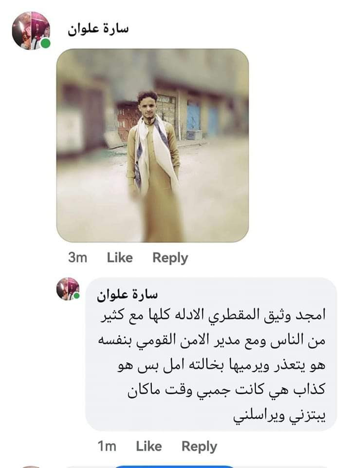 وأضاف المصدر، حصلت من قبل حادثة سرقة في العمارة كانو المتهمين انفسهم العائله المبتزة وعلى إثر ذلك تم طردهم من العمارة فانتقلوا إلى الجحملية بينما مازال أمجد وثيق المقطري يسكن في نفس الحي الذي تسكن فيه الناشطة سارة علوان ويدرس أيضا في جامعه السعيد.