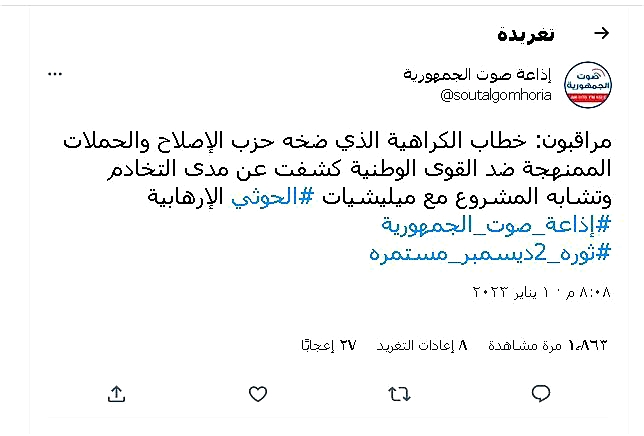 مراقبون: خطاب الكراهية الذي ضخه حزب الإصلاح والحملات الممنهجة ضد القوى الوطنية كشفت عن مدى التخادم وتشابه المشروع مع ميليشيات #الحوثي الإرهابية#إذاعة_صوت_الجمهورية #ثوره_2ديسمبر_مستمره