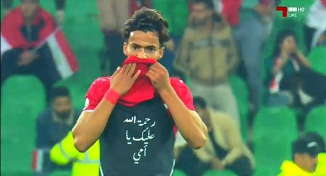 حيث ظهر اللاعب اليمني حمزة الريمي عقب إنتهاء المباراة وقد خلع قميصه ليظهر تحتها، جملة مؤثرة مكتوب عليها “رحمة الله عليكي يا أمي”.