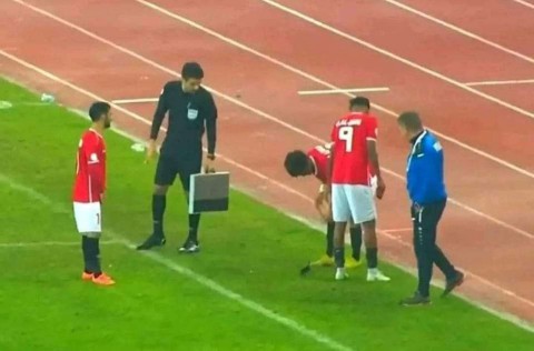 تداول ناشطون يمنيون على مواقع التواصل الاجتماعي صورا للاعبين يمنيين، أثناء تبادلهم واقي قصبة الساق.