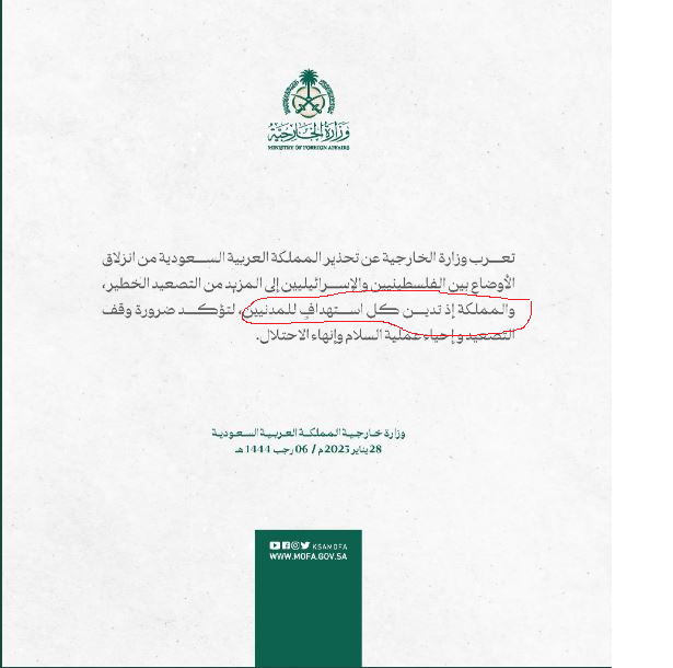 البيان المخزي الذي صدر مساء اليوم، بعد يومين من مجزرة العدو الصهيوني بحق أبناء فلسطين في مخيم جنين، الذي لم تحرك السعودية حينها ساكن إزاء هذه الجريمة وكل الجرائم التي سبقتها.