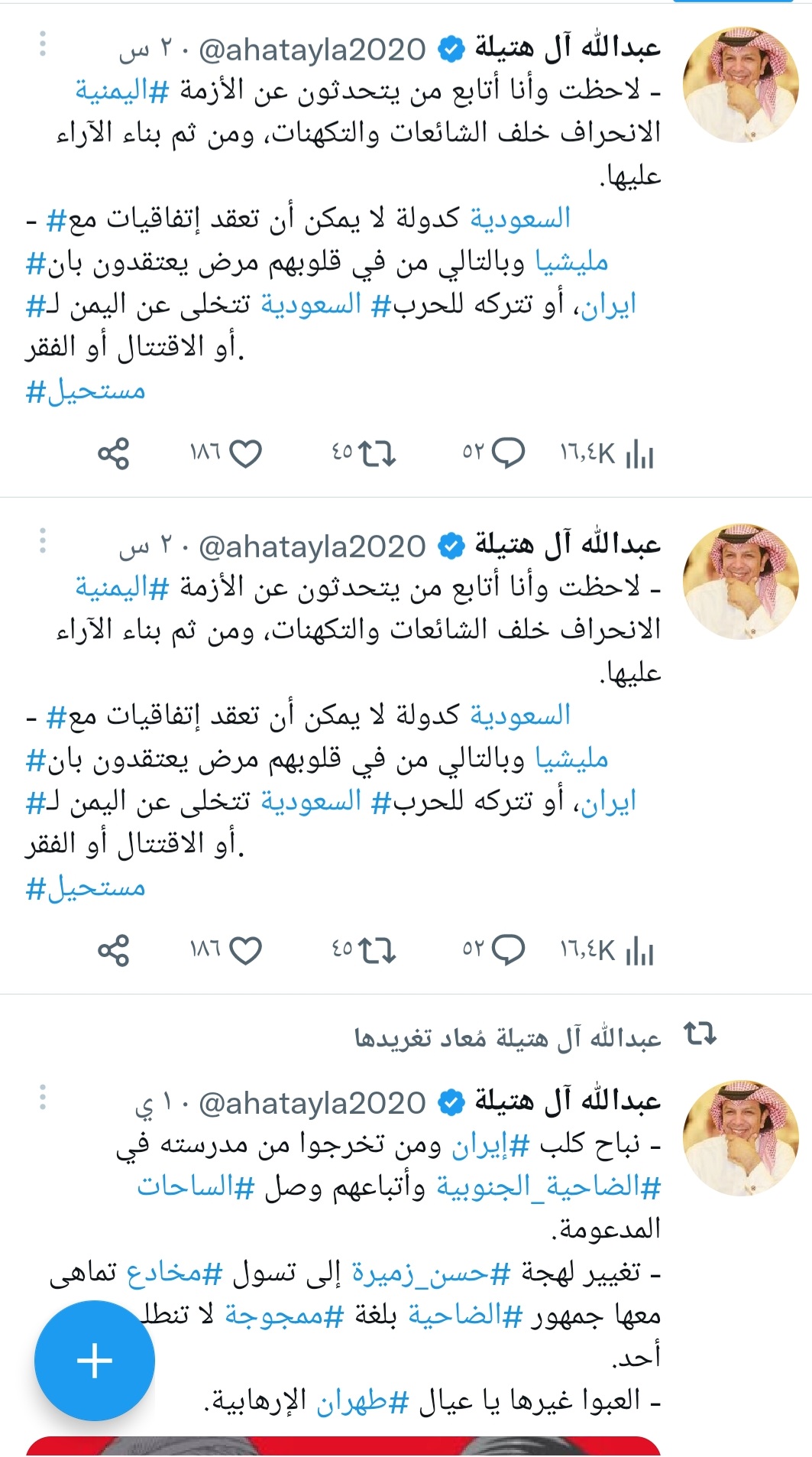 – #السعودية كدولة لا يمكن أن تعقد إتفاقيات مع #مليشيا وبالتالي من في قلوبهم مرض يعتقدون بان #السعودية تتخلى عن اليمن لـ #ايران، أو تتركه للحرب أو الاقتتال أو الفقر.#مستحيل— عبدالله آل هتيلة (@ahatayla2020) January 22, 2023