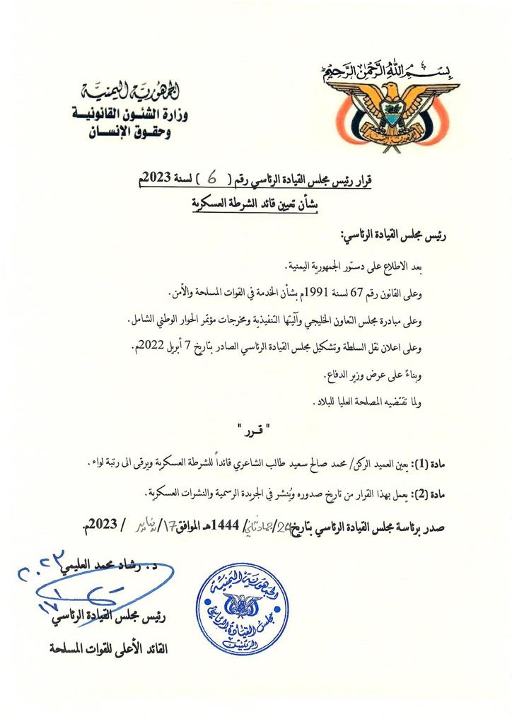 ونص قرار رئيس مجلس القيادة الرئاسي رقم (6) بتعيين العميد الركن محمد صالح سعيد الشاعري قائدا للشرطة العسكرية