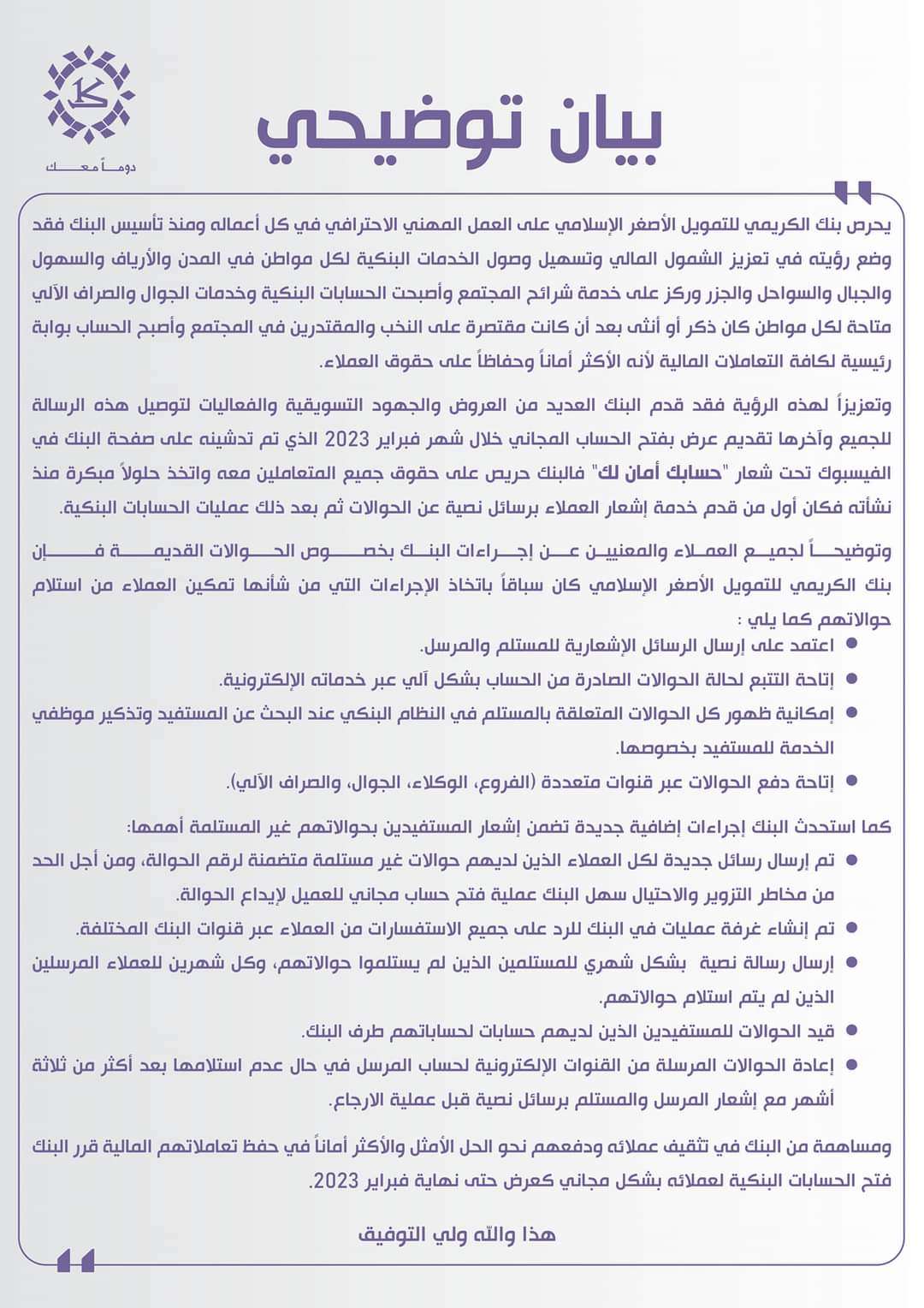 واتخذ البنك عدة اجراءات لإعادة الحوالات المنسية لأصحابها بحسب ما جاء في البيان التالي ;